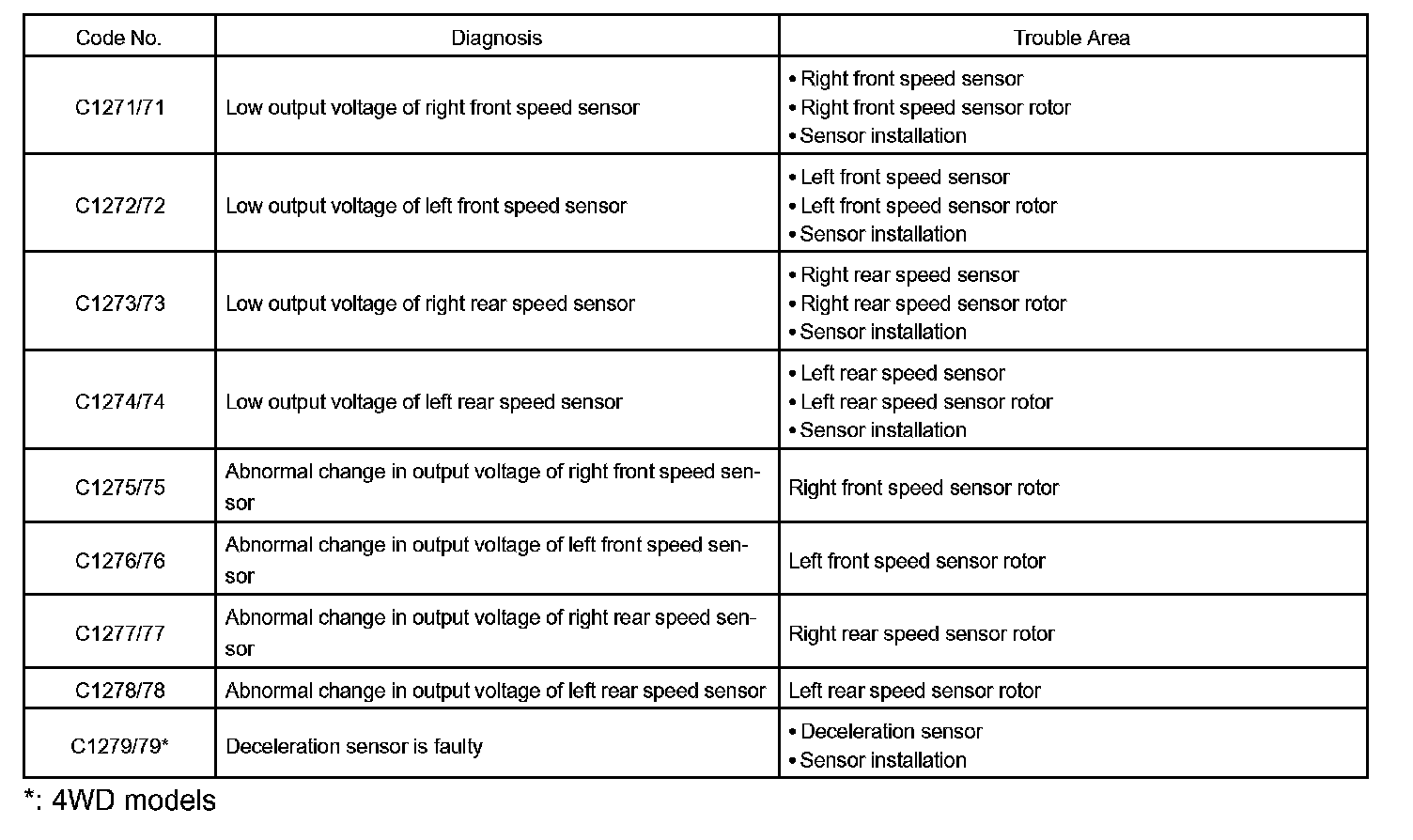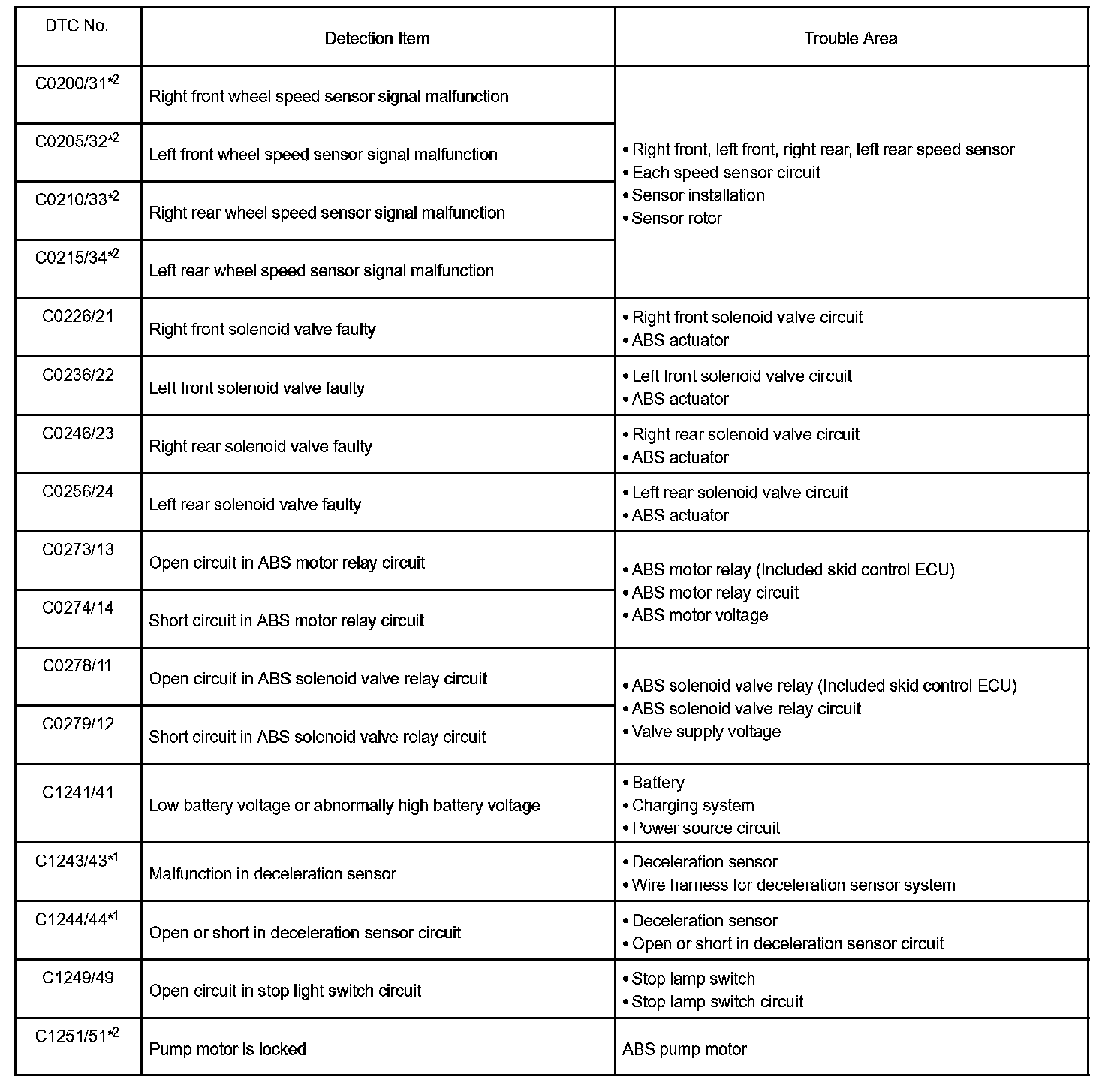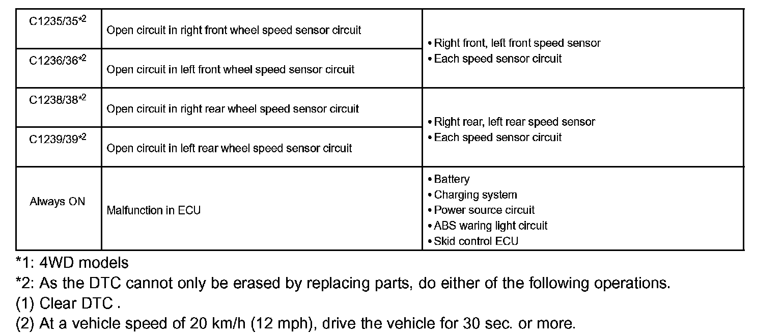 DTC chart of ABS system