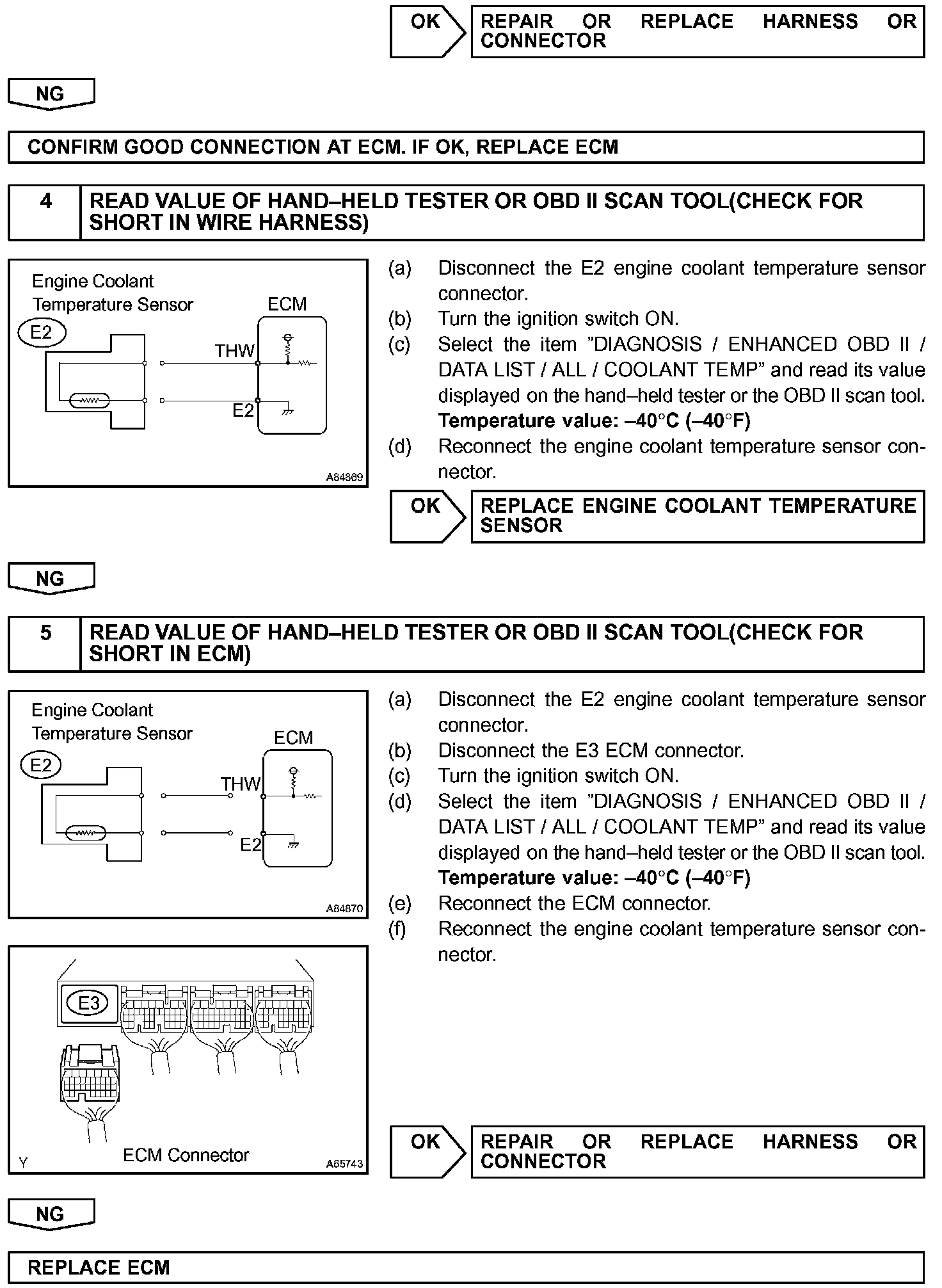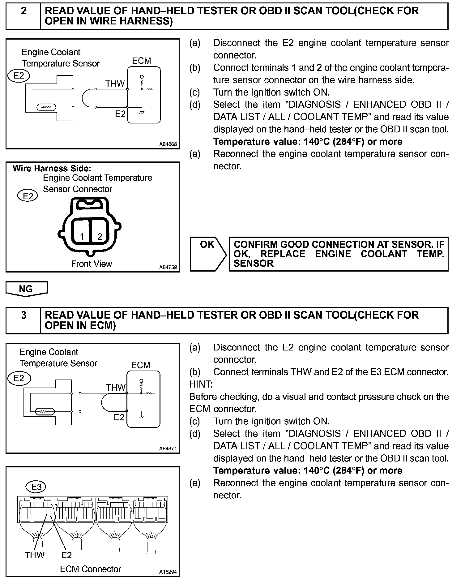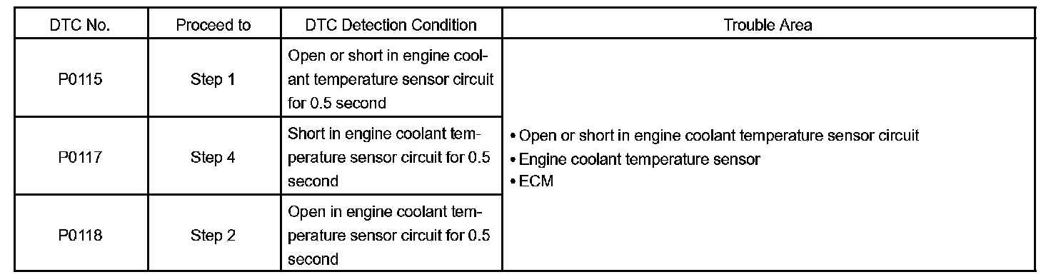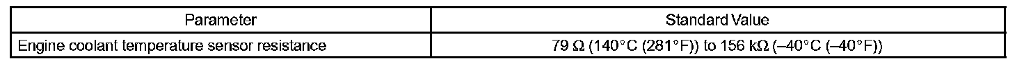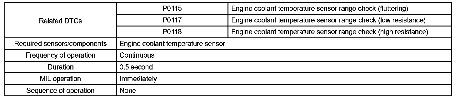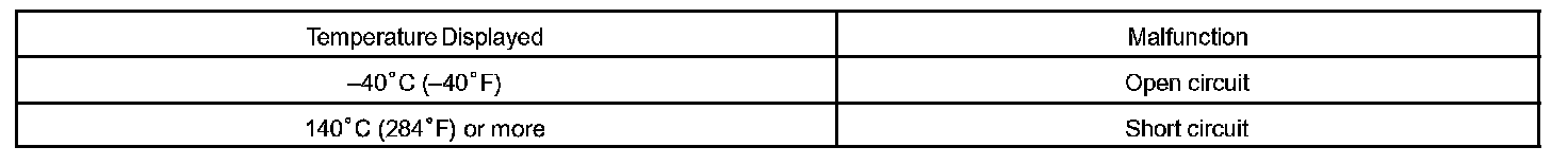 When the ECM calculates that the ECT is -40 °C (-40 °F), or more than 140 °C (284 °F), and if either the condition continues 0.5 sec or more, the ECM will set a DTC.