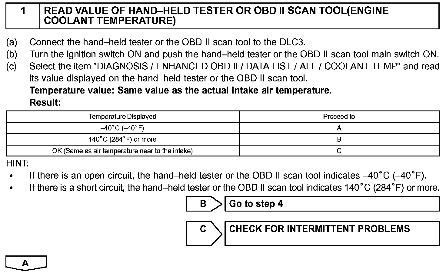 HINT: After confirming DTC P0115, P0117 or P0118, confirm the engine coolant temperature in the "DIAGNOSIS/ ENHANCED OBD II/DATA LIST/ALL" using the hand-held tester or the OBD II scan tool.