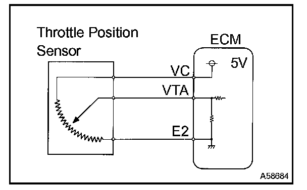 When the throttle valve is fully closed, a voltage of approximately 0.3 to 1.0 V is applied to terminal VTA of the ECM. The voltage applied to terminal VTA of the ECM increases in proportion to the opening angle of the throttle valve and becomes approximately 3.2 to 4.9 V when the throttle valve is fully opened. The ECM judges the vehicle driving conditions from these signals input from terminal VTA, uses them as one of the conditions for deciding the air-fuel ratio correction, power increase correction and fuel-cut control etc.