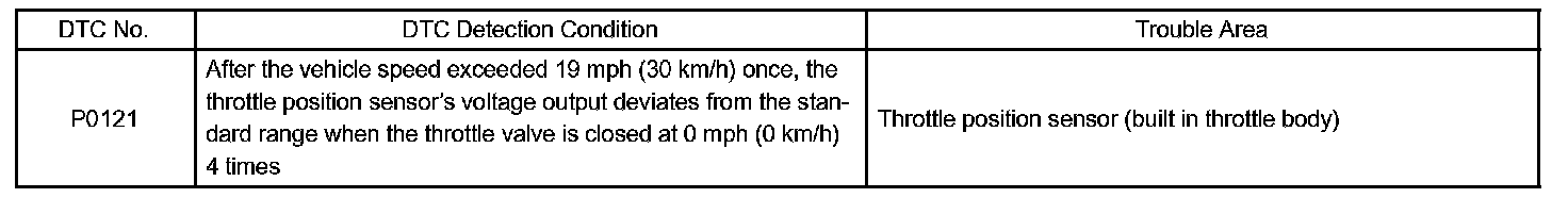 The ECM checks the indicated angle of the throttle valve during "stop and go" conditions. If the indicated angle (or voltage) in the "closed throttle" position is out of the specified range, the ECM interprets this as a malfunction in the throttle position sensor and sets a DTC.
