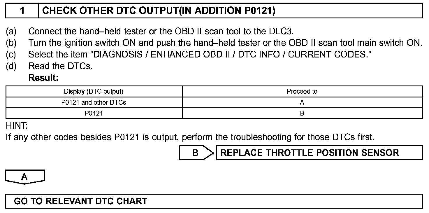 DTC P0121 THROTTLE/PEDAL POSITION SENSOR/SWITCH "A" CIRCUIT RANGE/PERFORMANCE PROBLEMHINT: This is the purpose of the "throttle position sensor".