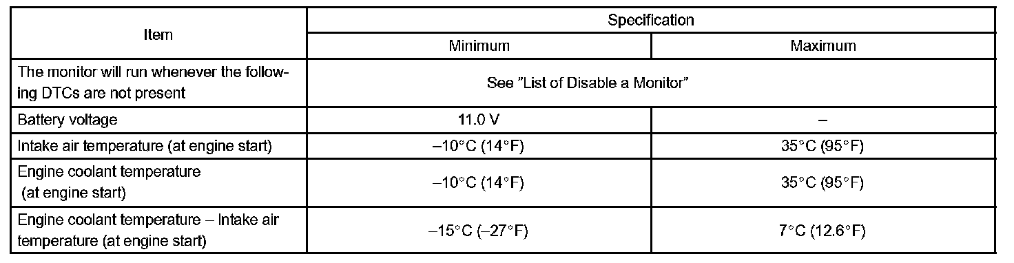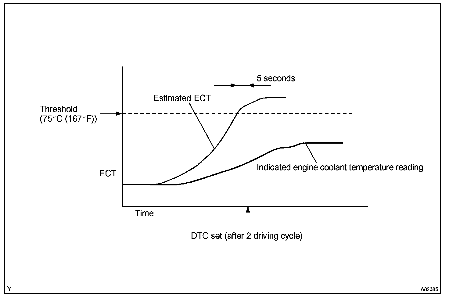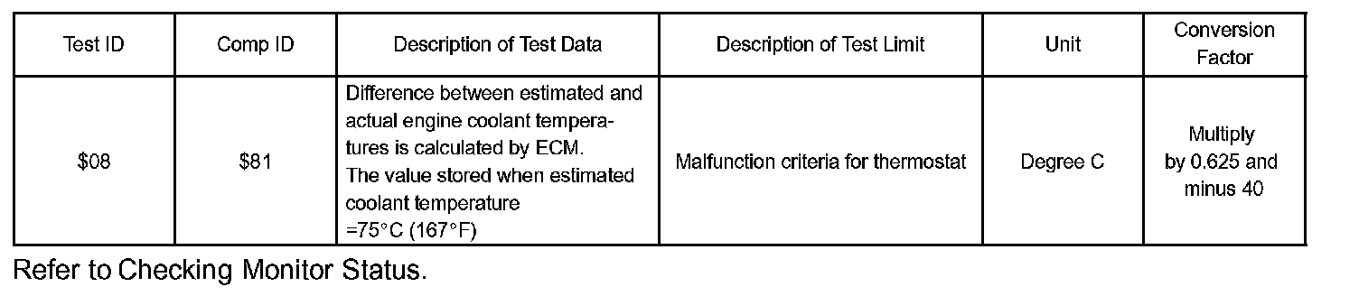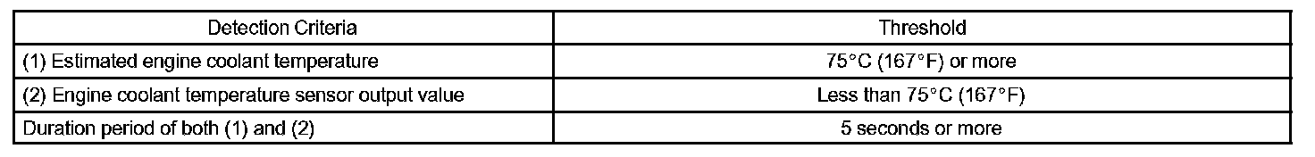 The ECM estimates the engine coolant temperature (ECT) based on starting temperature, engine loads, and engine speeds. The ECM then compares the estimated ECT with the actual ECT. When the estimated ECT reaches 75 °C (167 °F) the ECM checks the actual ECT. If the actual ECT is less than 75 °C (167 °F), the ECM will interpret this as a fault in the thermostat or engine cooling system and set a DTC.