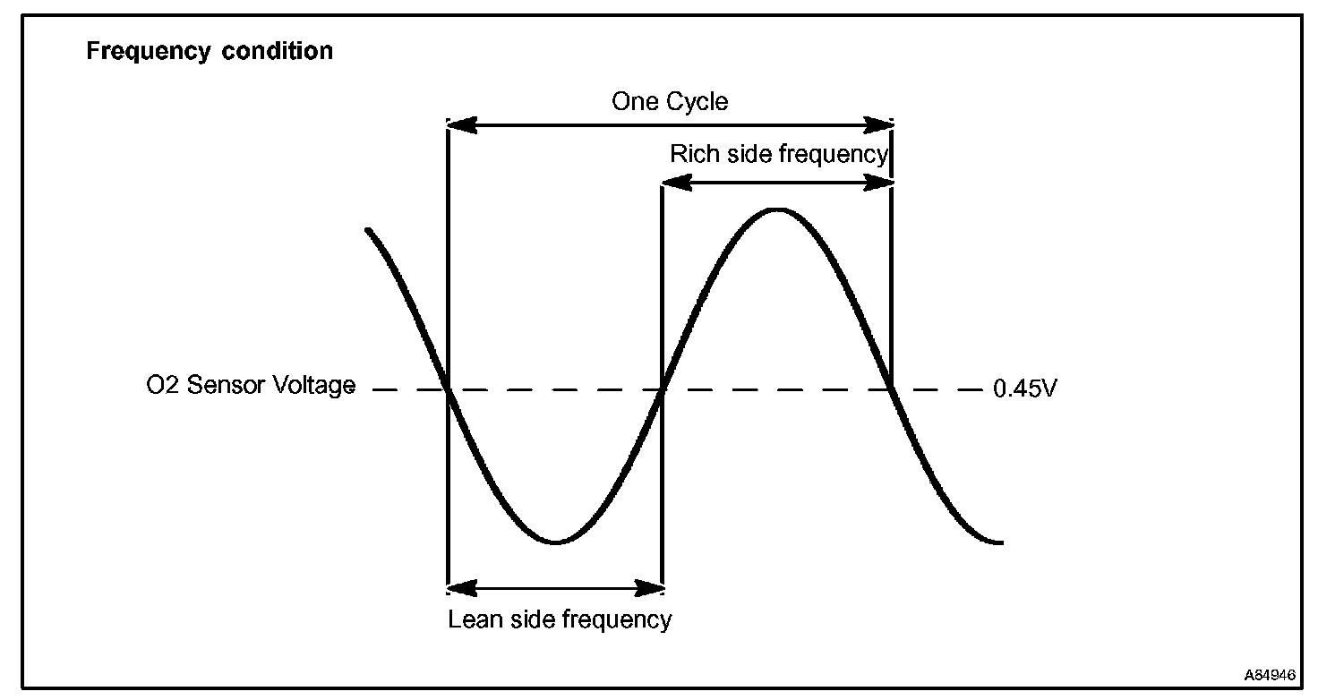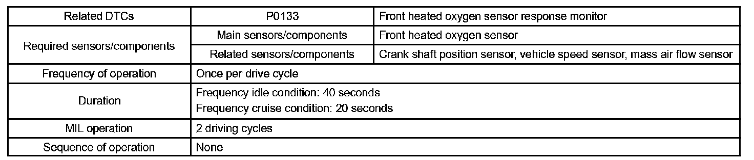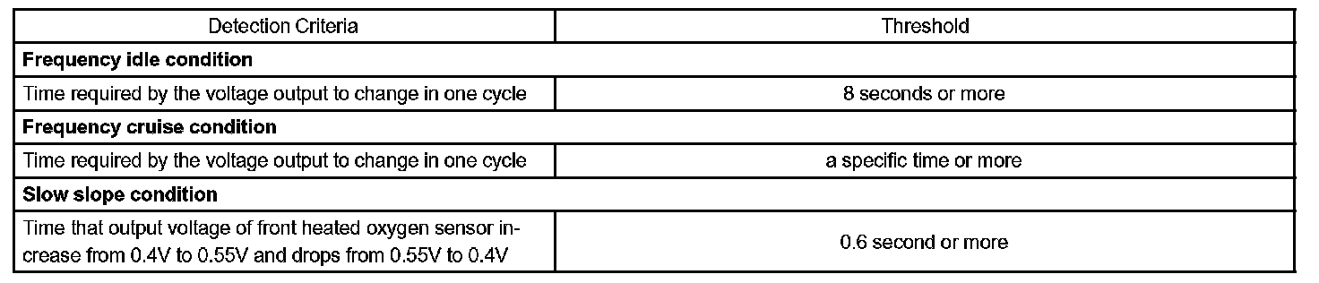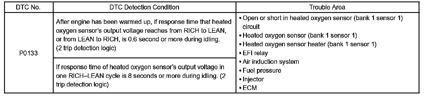 The ECM monitors the response feature of the heated oxygen sensor. If the response time of the sensor output status change from RICH to LEAN or vice versa becomes longer, the ECM interprets this as a malfunction in the heated oxygen sensor and sets a DTC.