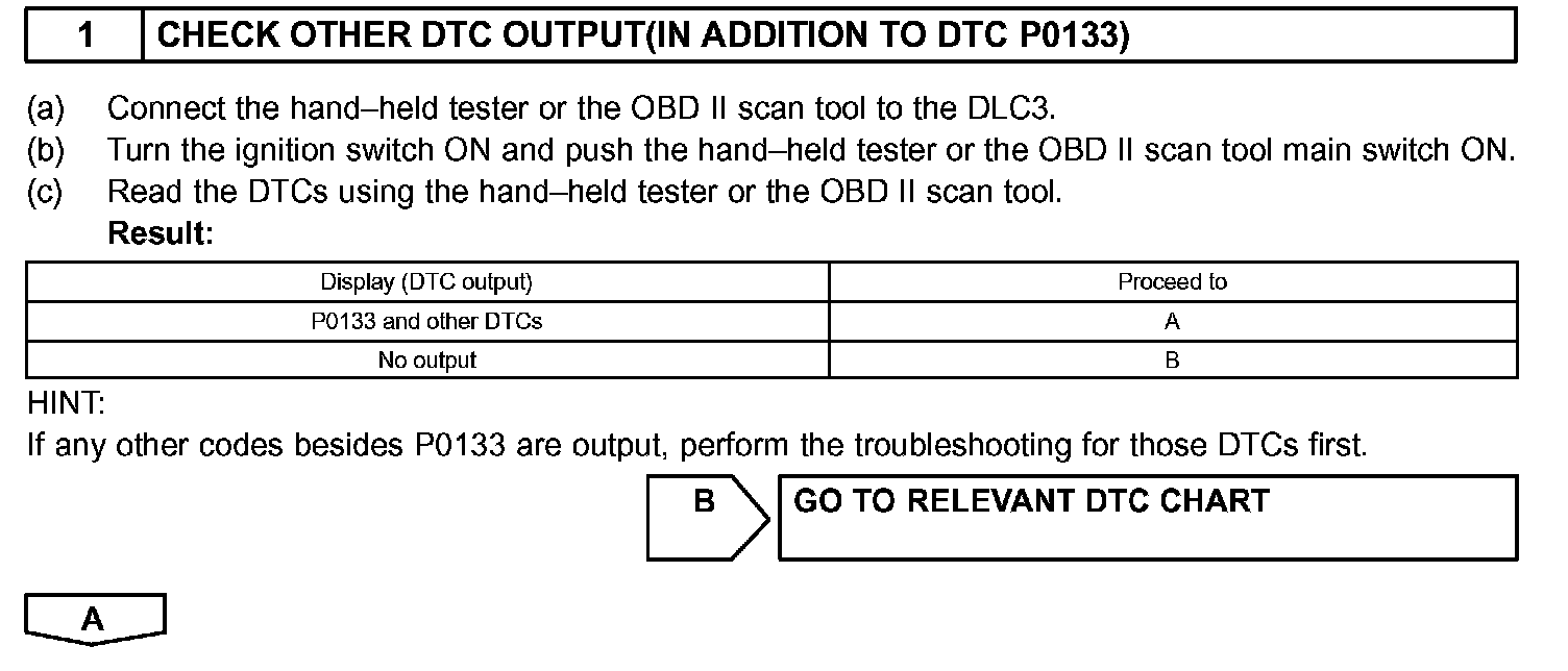 NOTE: If the vehicle is short of fuel, the air-fuel ratio becomes LEAN and DTC P0133 will be recorded, and the MIL then comes on.