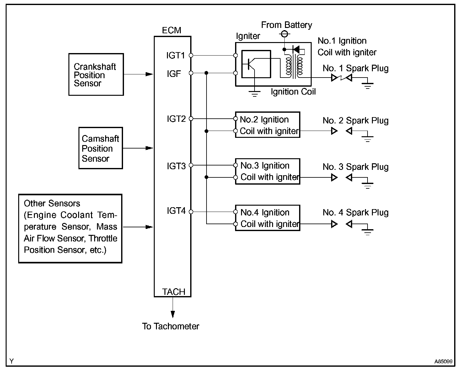 The ECM determines the ignition timing and outputs the ignition (IGT) signals for each cylinder. Using the IGT signal, the ECM turns on and off the power transistor inside the igniter and this switches on and off the current to the primary coil. When the current flow to the primary coil is cut off, high-voltage is generated in the secondary coil and this voltage is applied to the spark plugs to spark inside the cylinders. As the ECM cuts the current to the primary coil, the igniter sends back the ignition confirmation (IGF) signal for each cylinder ignition to the ECM.