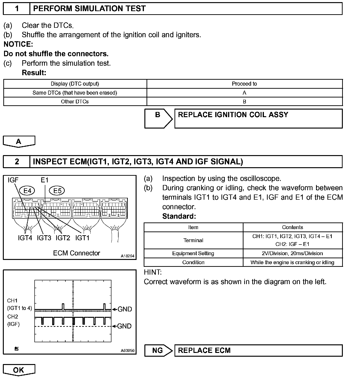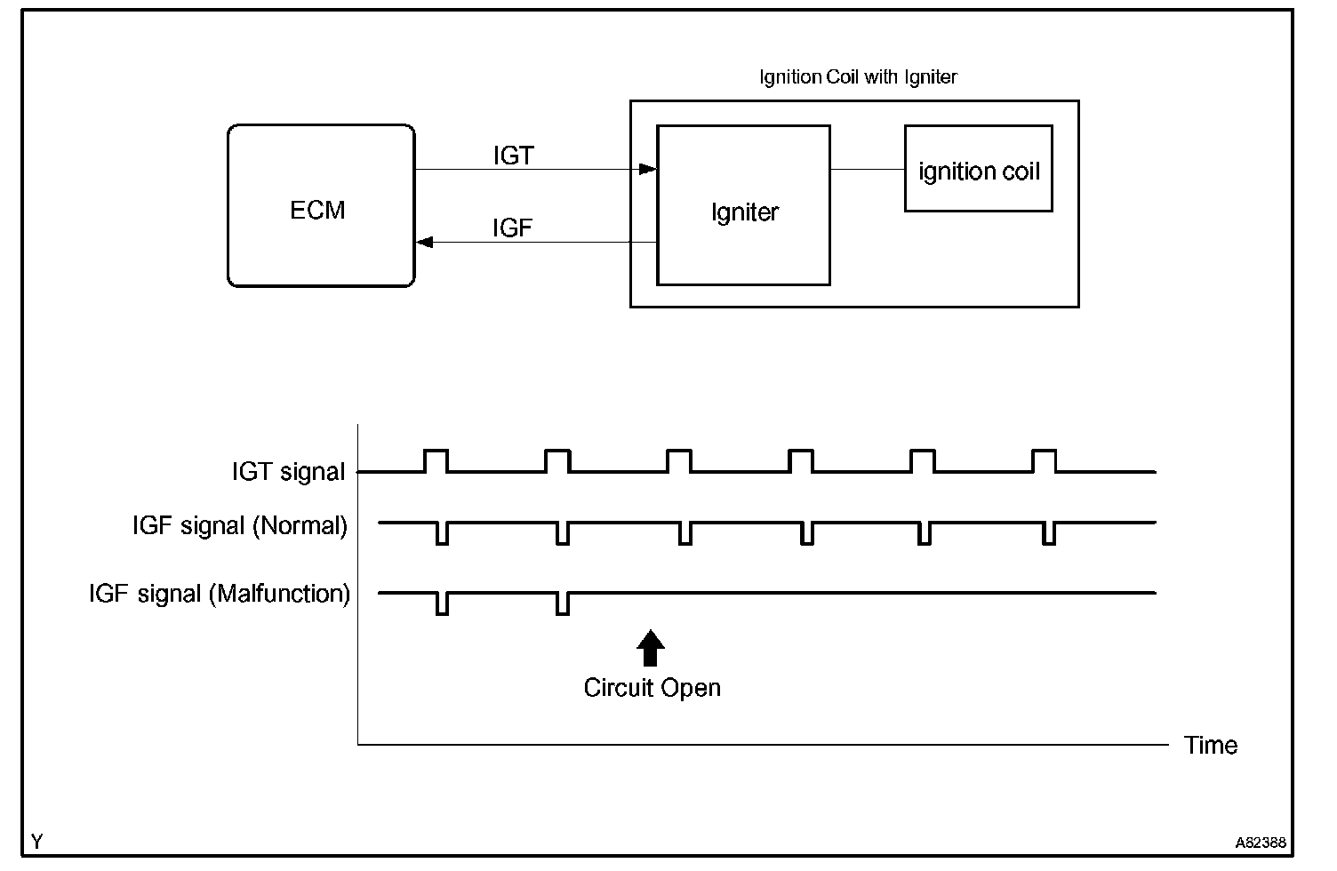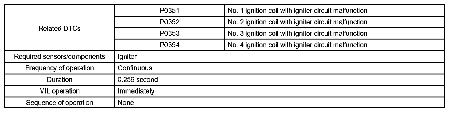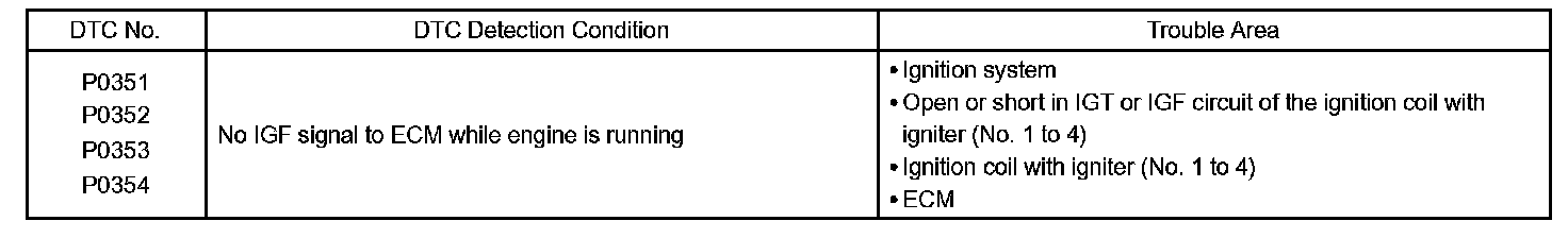 If the ECM does not receive the ignition confirmation (IGF) signal despite sending the ignition (IGT) signal, the ECM interprets this as a fault in the igniter and sets a DTC.