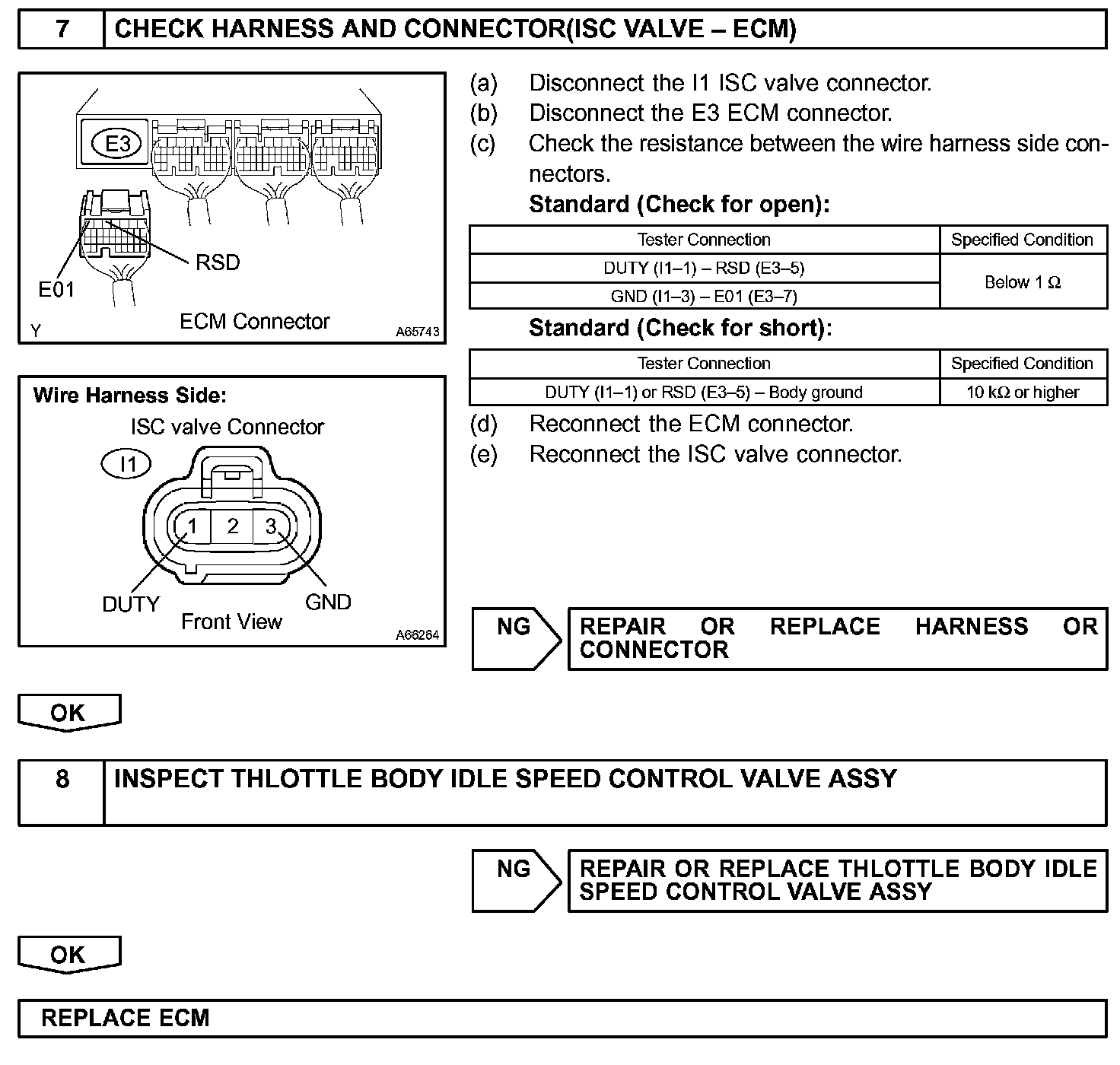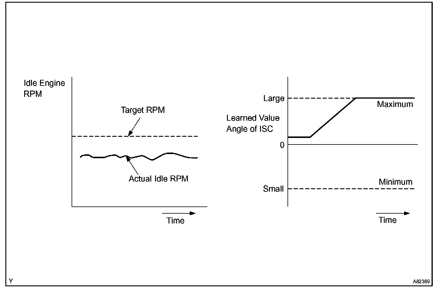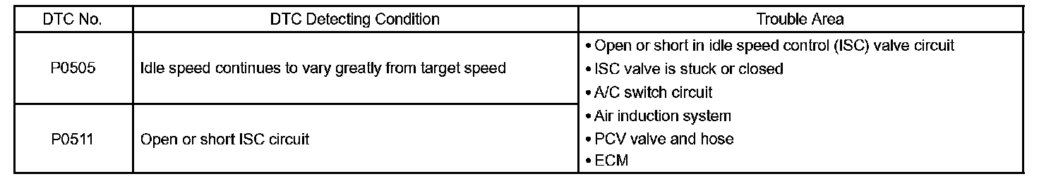 Although the ECM regulates the idle engine RPM with the feedback control in several vehicle stopped, actual idle RPM does not reach the targeted RPM and a learned valve angle of the idle speed control (ISC) remains at the maximum or remains at the minimum, the ECM determines to detect malfunction in the ISC system.