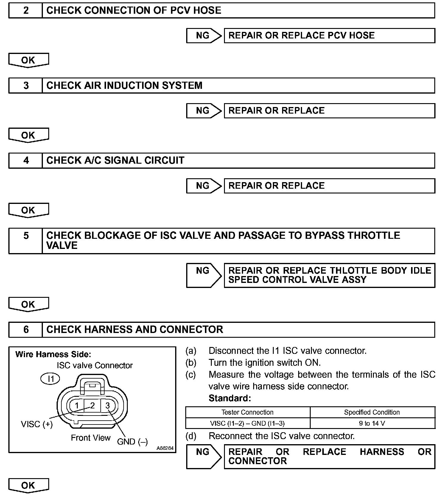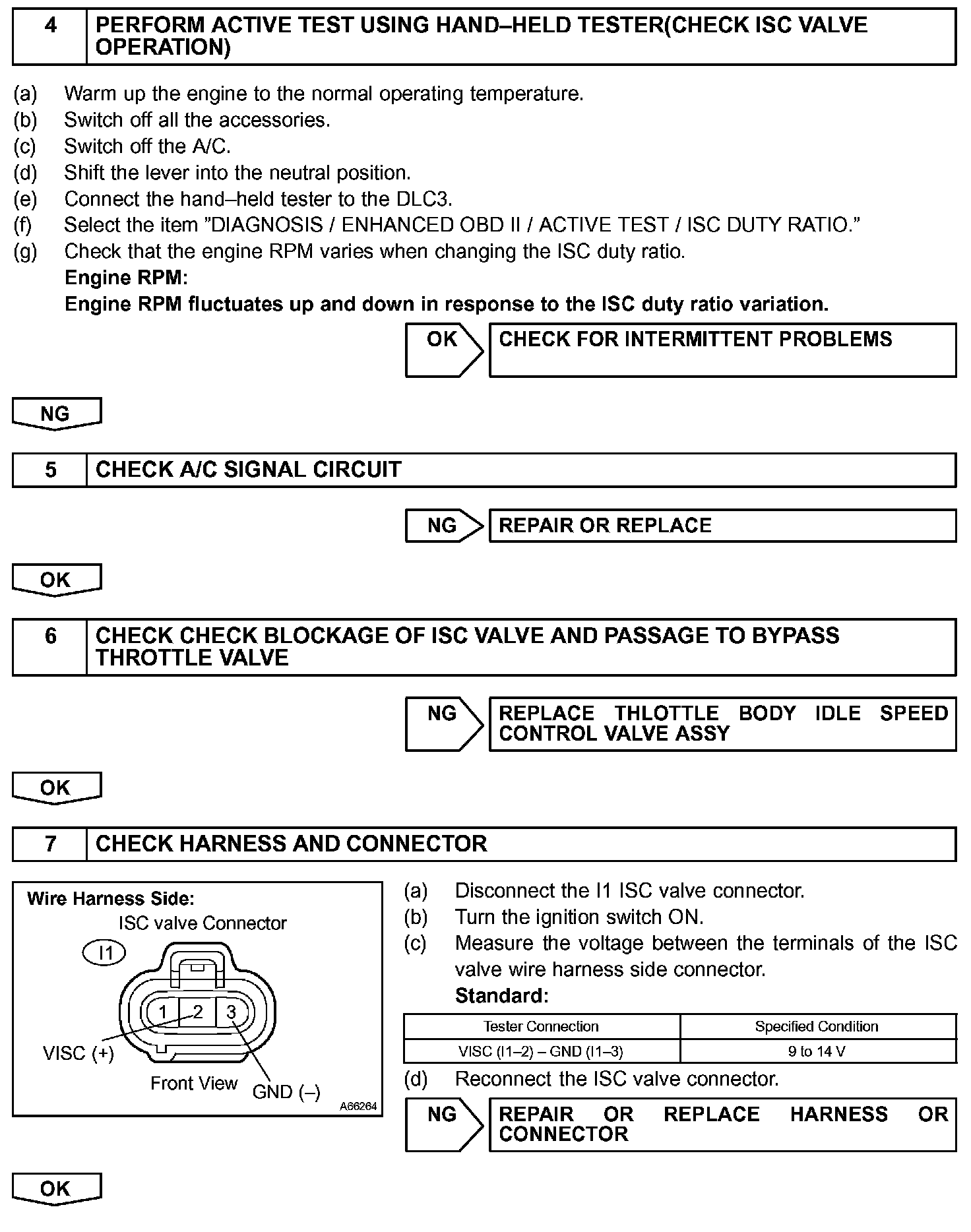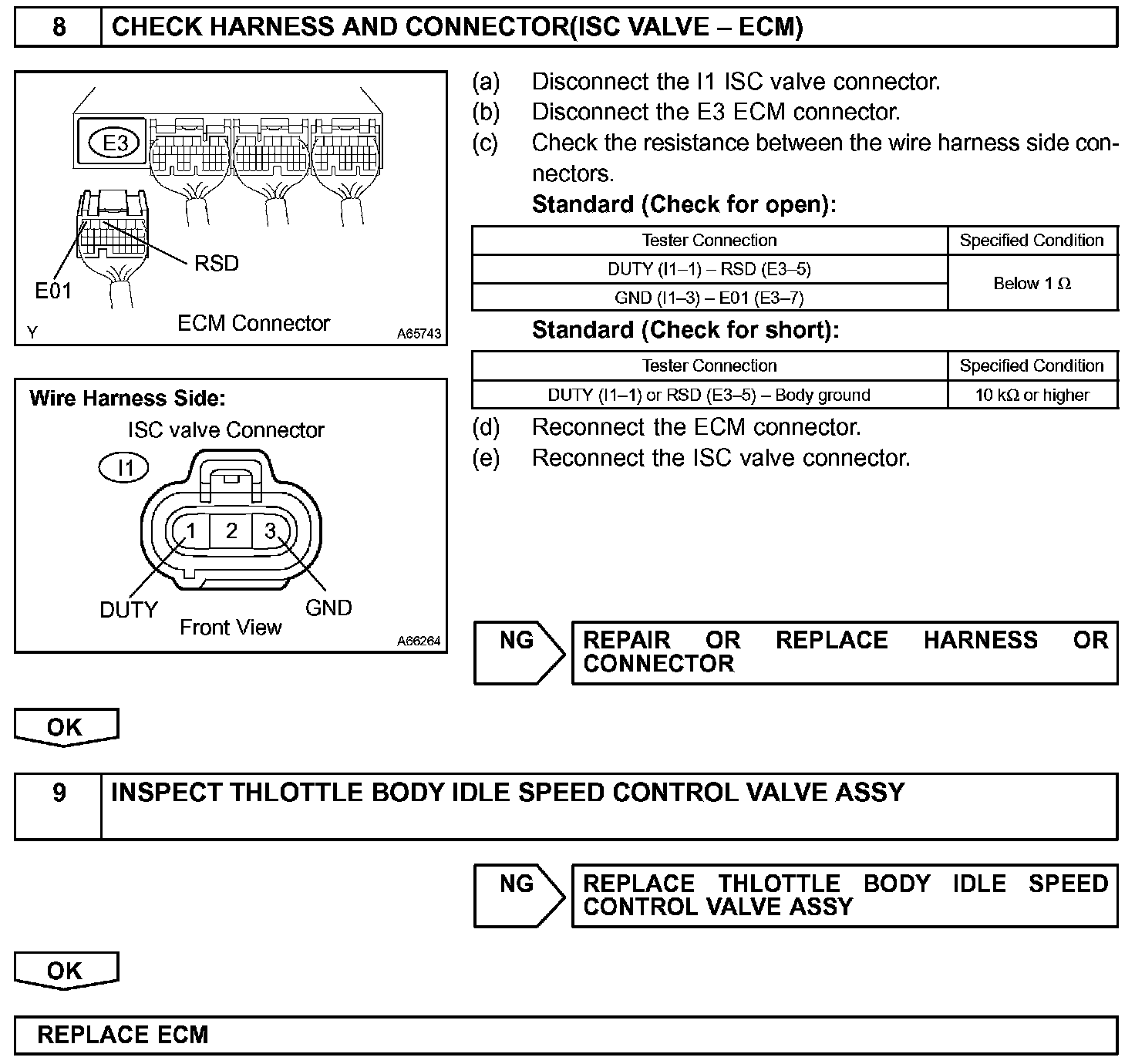 Although the ECM regulates the idle engine RPM with the feedback control in several vehicle stopped, actual idle RPM does not reach the targeted RPM and a learned valve angle of the idle speed control (ISC) remains at the maximum or remains at the minimum, the ECM determines to detect malfunction in the ISC system.