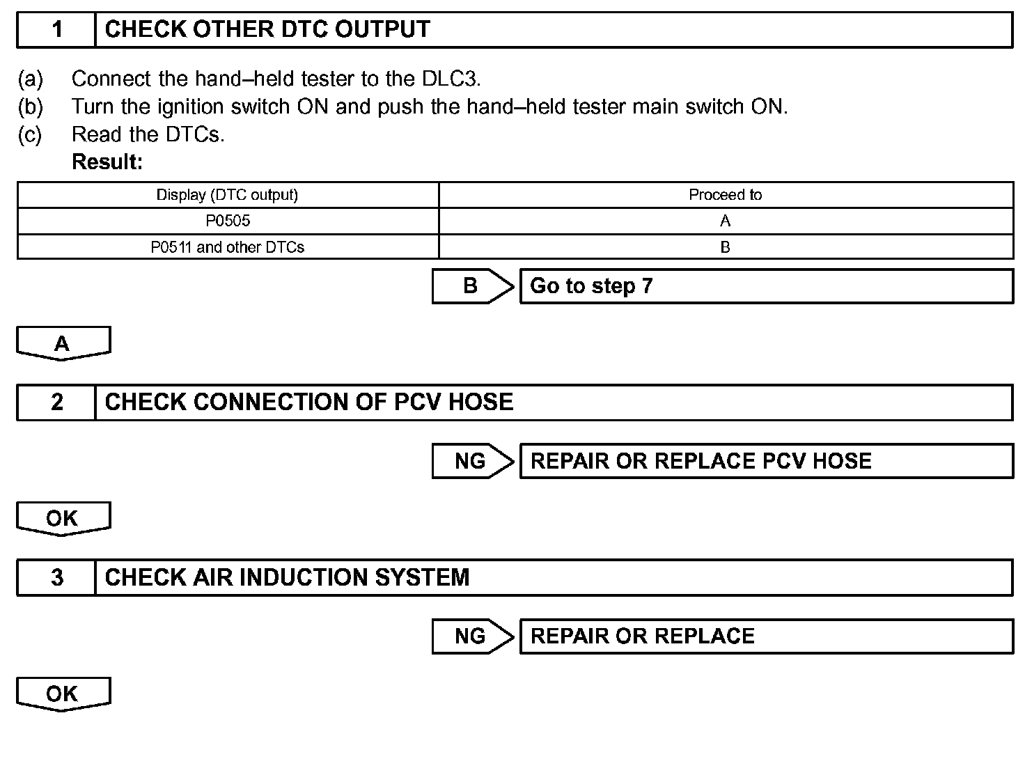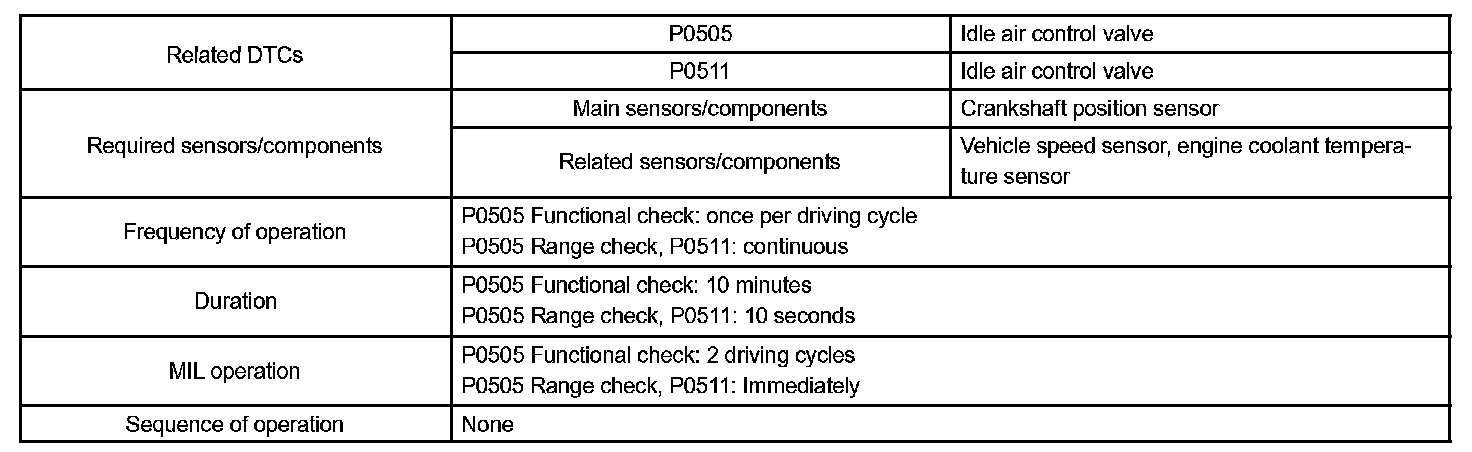 P0511 is detected as an open/short circuit in the IAC if the rate of duty signal input to the IAC valve has stuck at 0 % or 100 %.