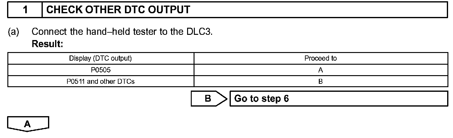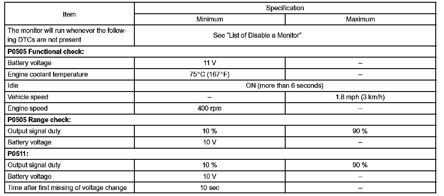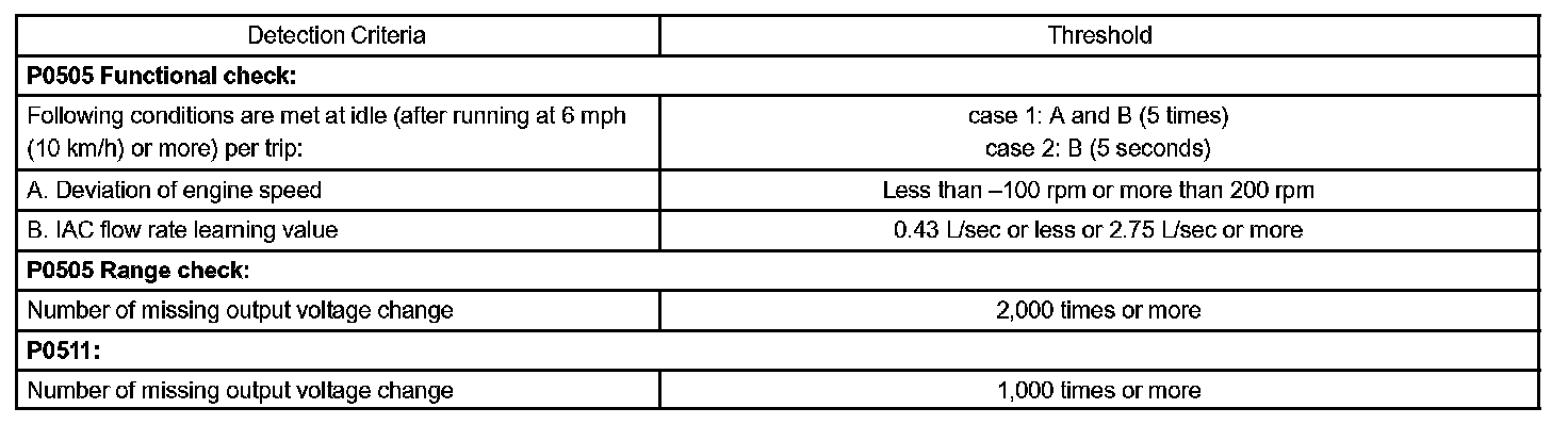 If the difference between the targeted and actual idle engine RPMs exceeds 200 rpm (*1) with the vehicle stopped in an idle, and this occurs 5 times, or if the learned value angle of the IAC remains at maximum or minimum angle for 5 seconds, DTC P0505 is detected.