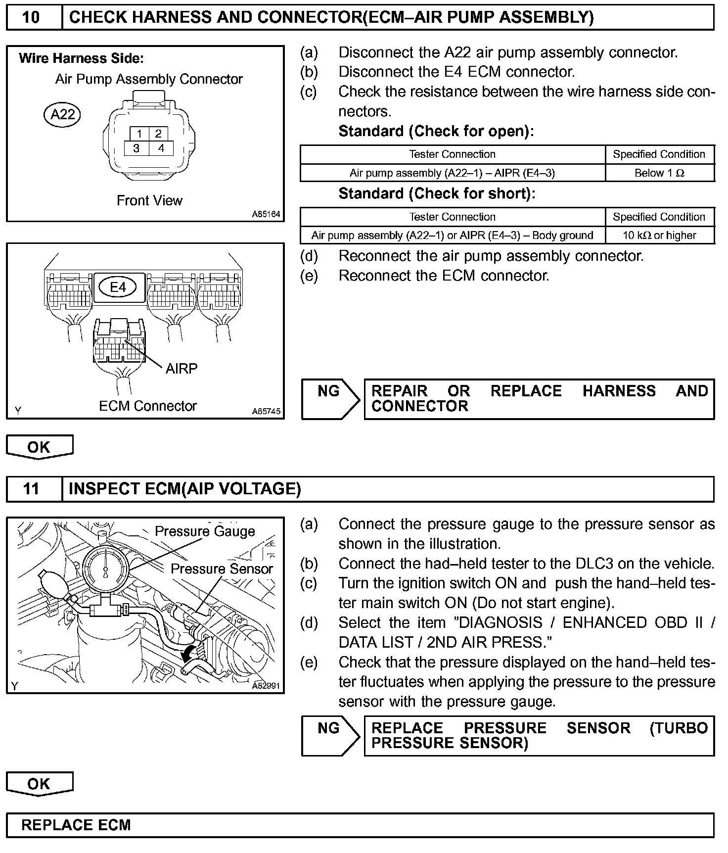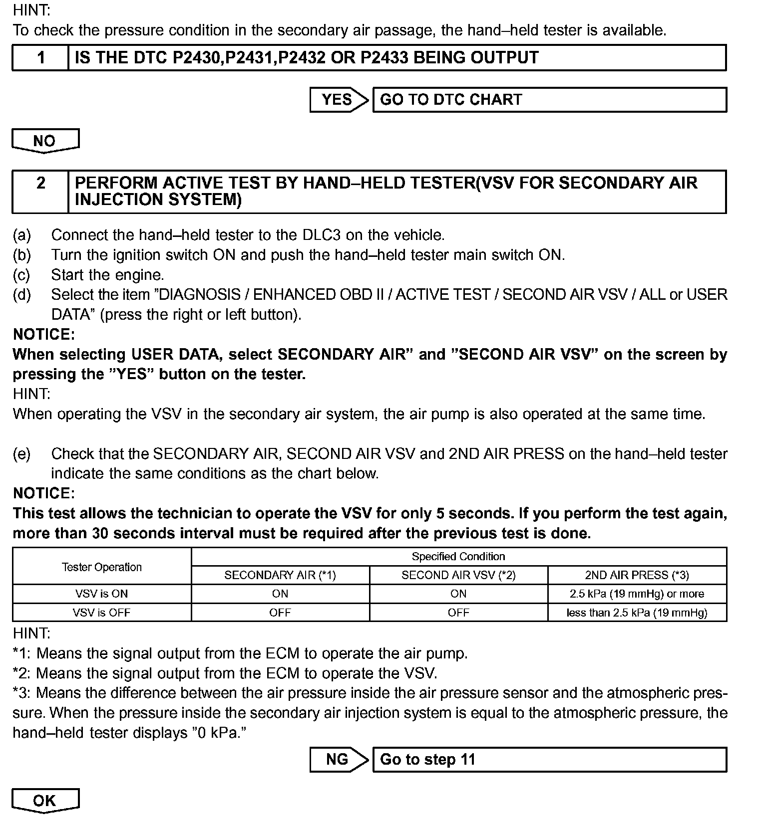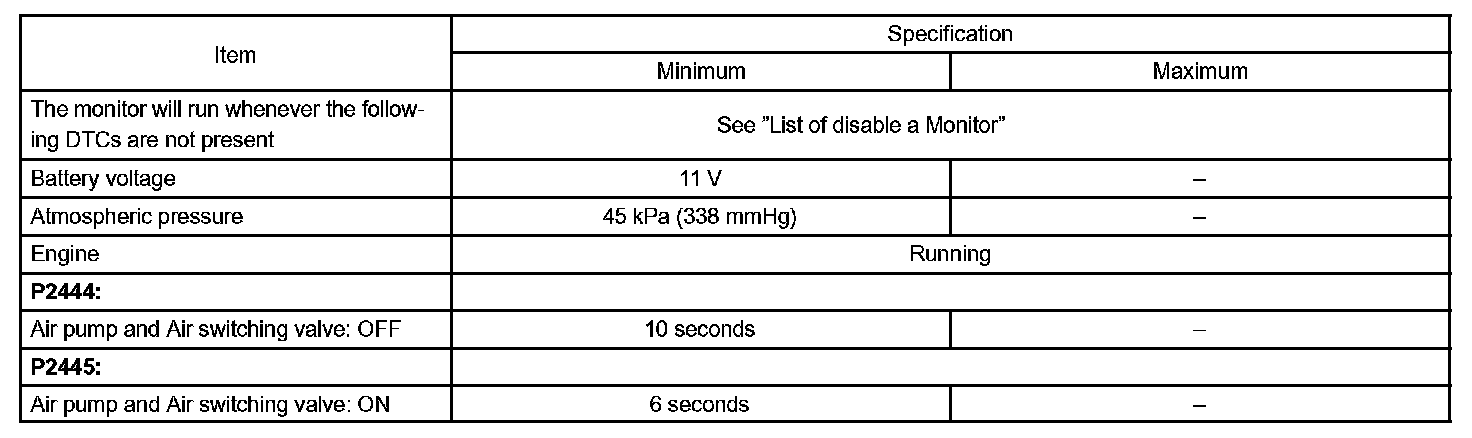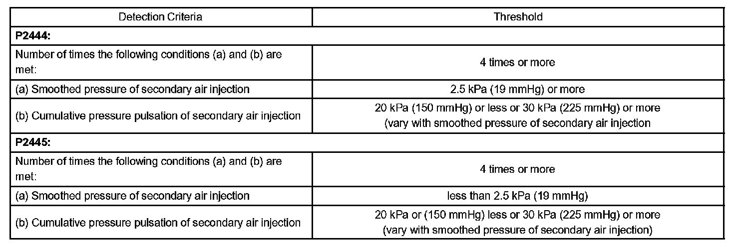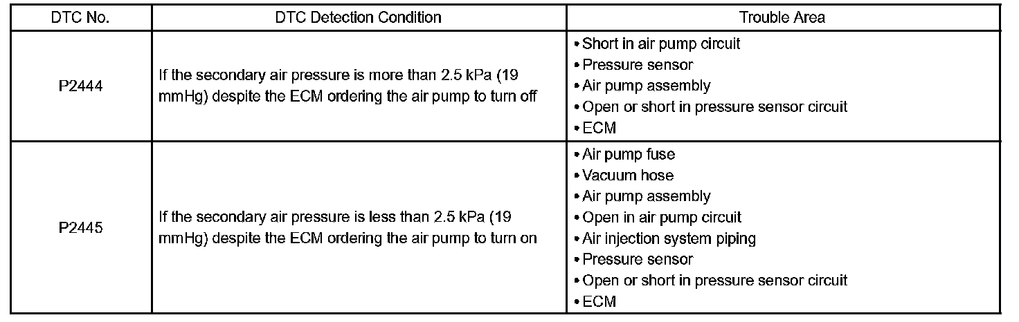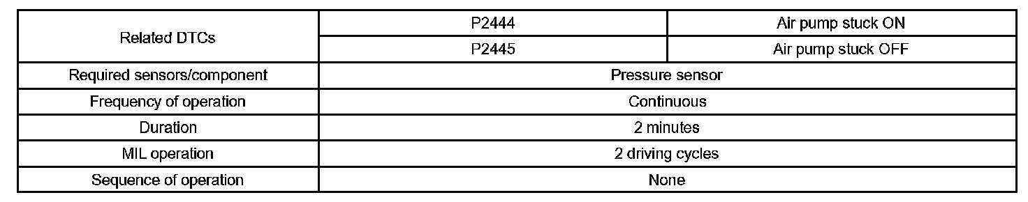 If the pressure level from the sensor has not reached a certain level despite the ECM turning on the air pump, or if the pressure level exceeds the threshold despite the ECM turning off the air pump, the ECM interprets this as a fault in the secondary air injection system and sets a DTC.