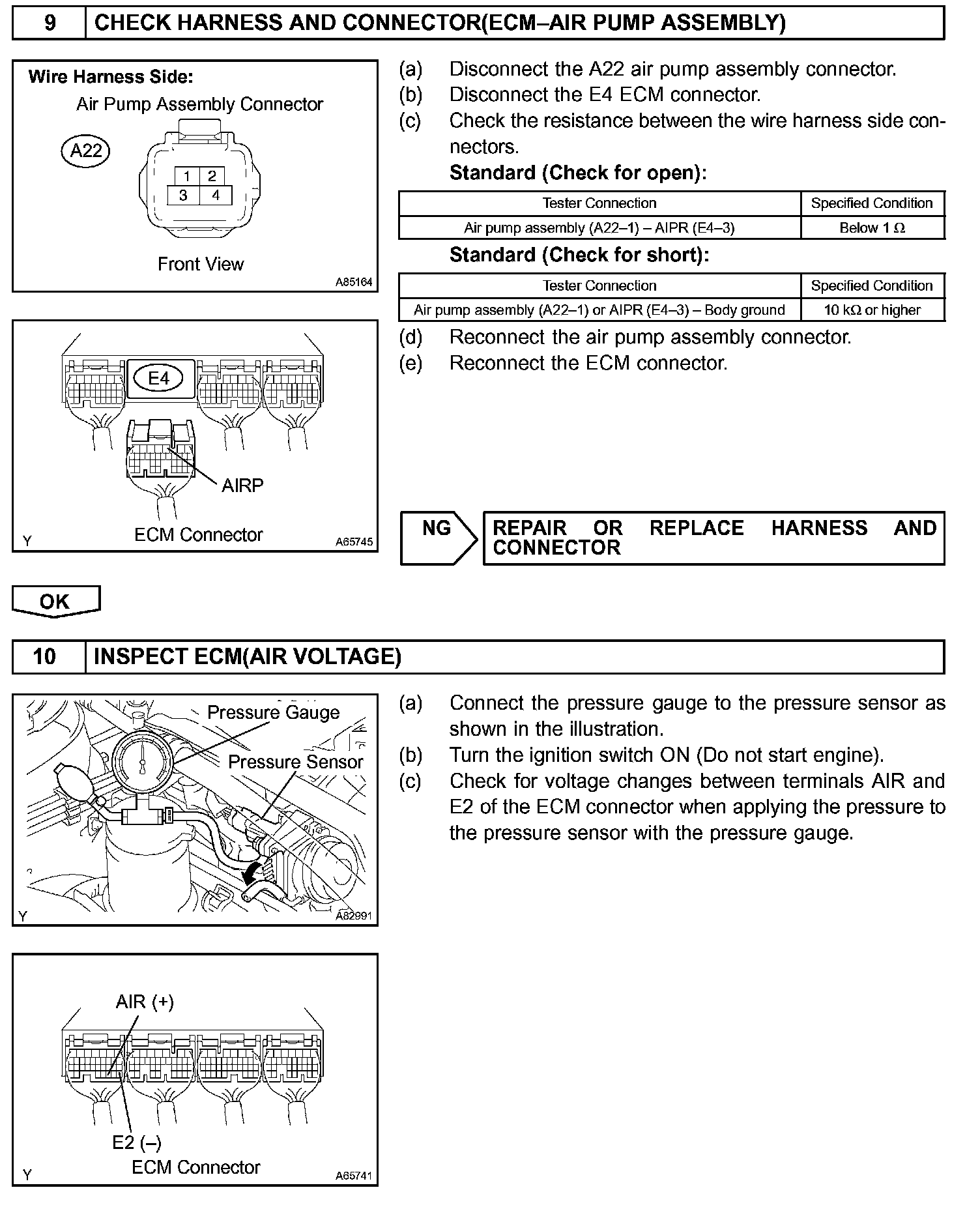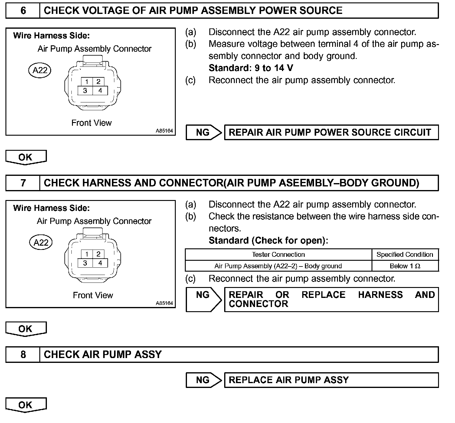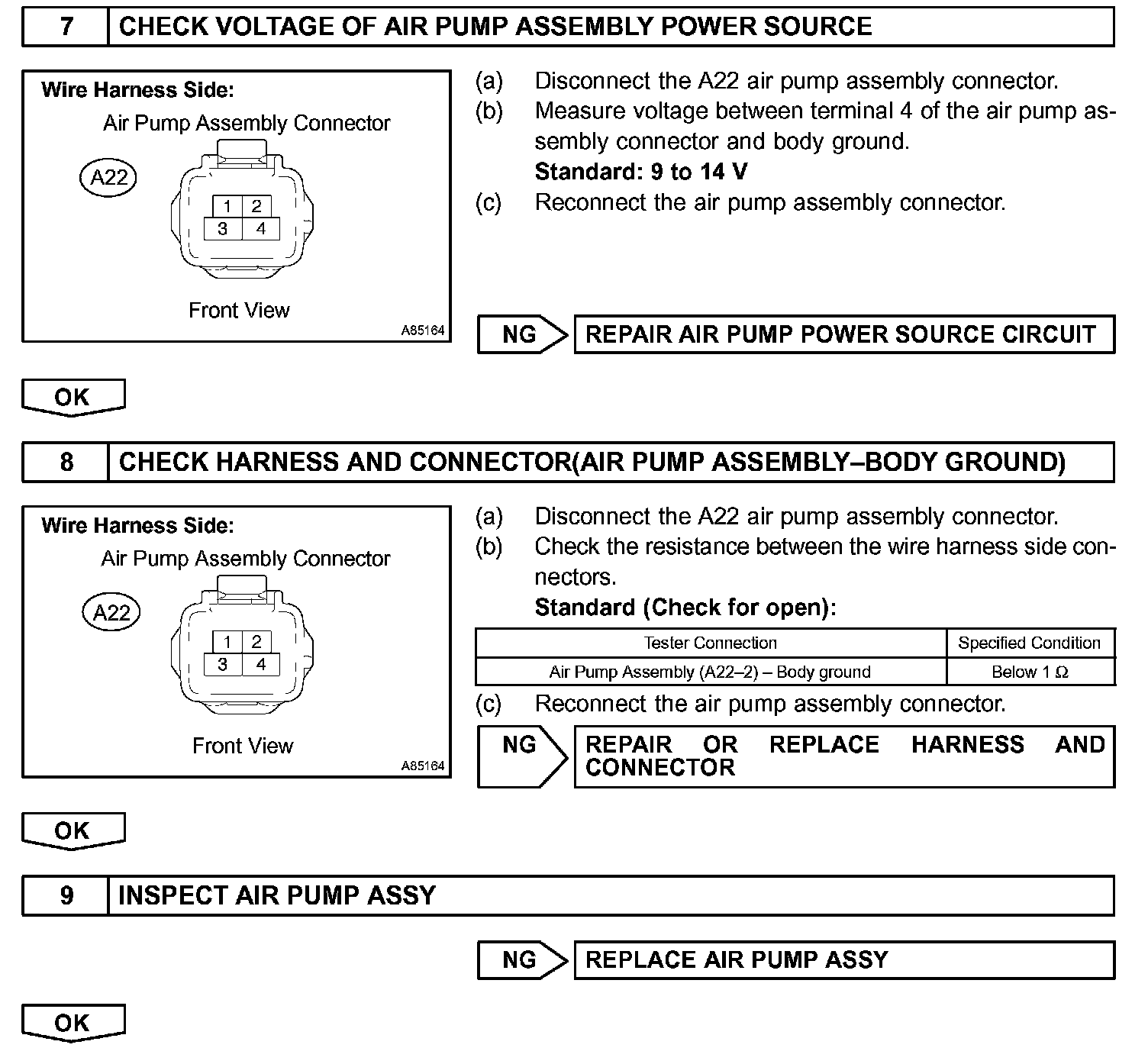 To accelerate the activation of catalyst when warming up the engine, the air injection system pumps the secondary air to the exhaust manifold. The secondary air is supplied by the air pump and it is pumped to the exhaust manifold through the air switching valve. Open and close movement of the air switching valve is regulated by the vacuum switching valve (VSV).The air pump and the air switching valve are observed by the ECM and are used to detect malfunction in this system.