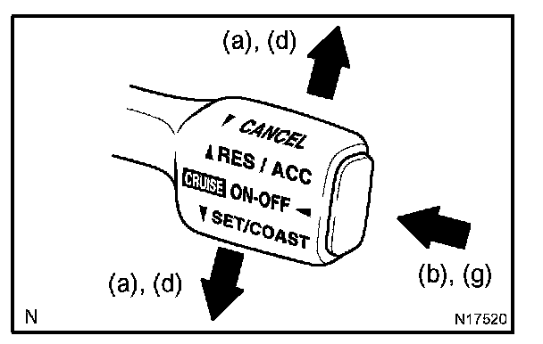 a. Keep the cruise control main switch assy to SET/COAST or RES/ACC position and hold it down or hold it up.