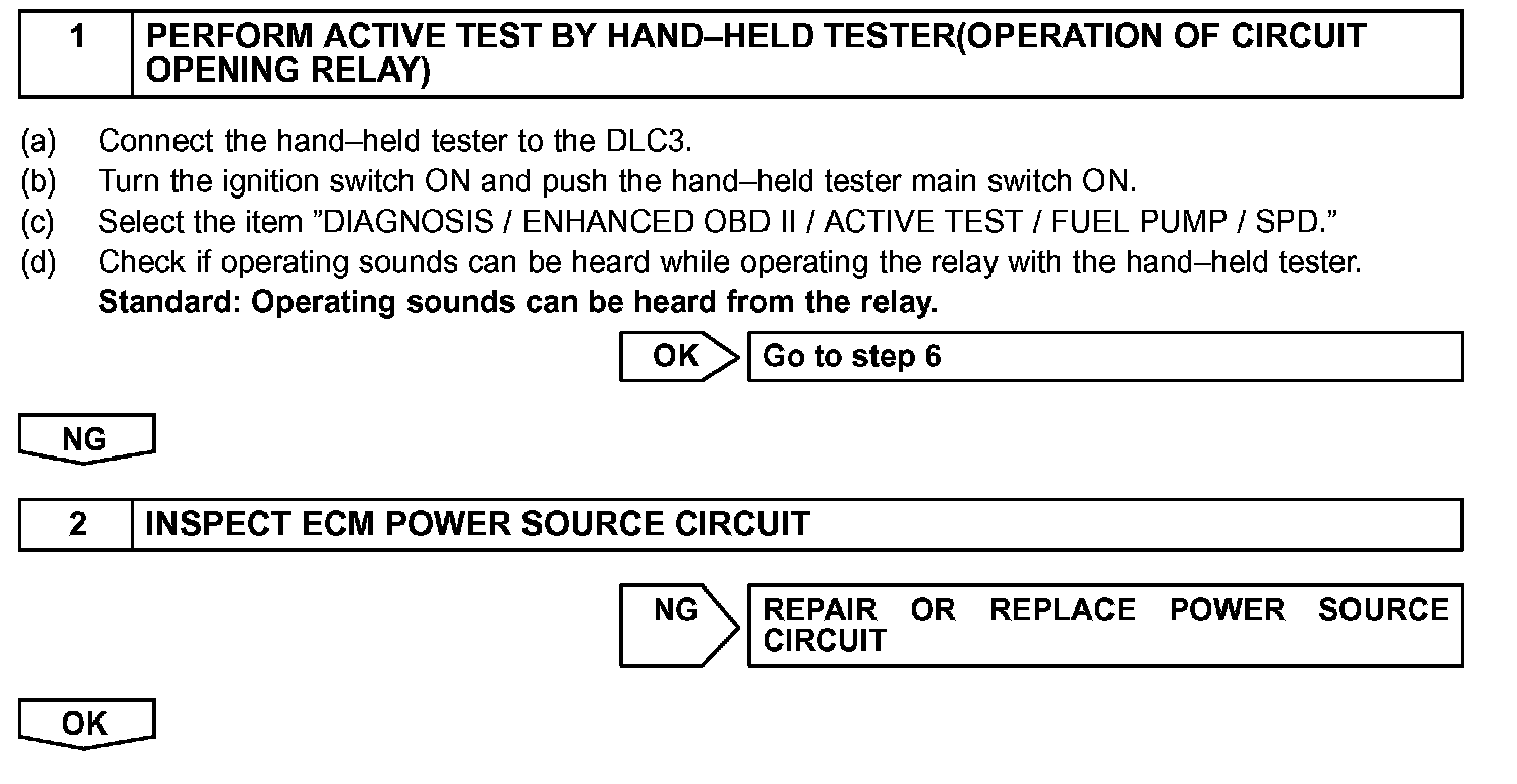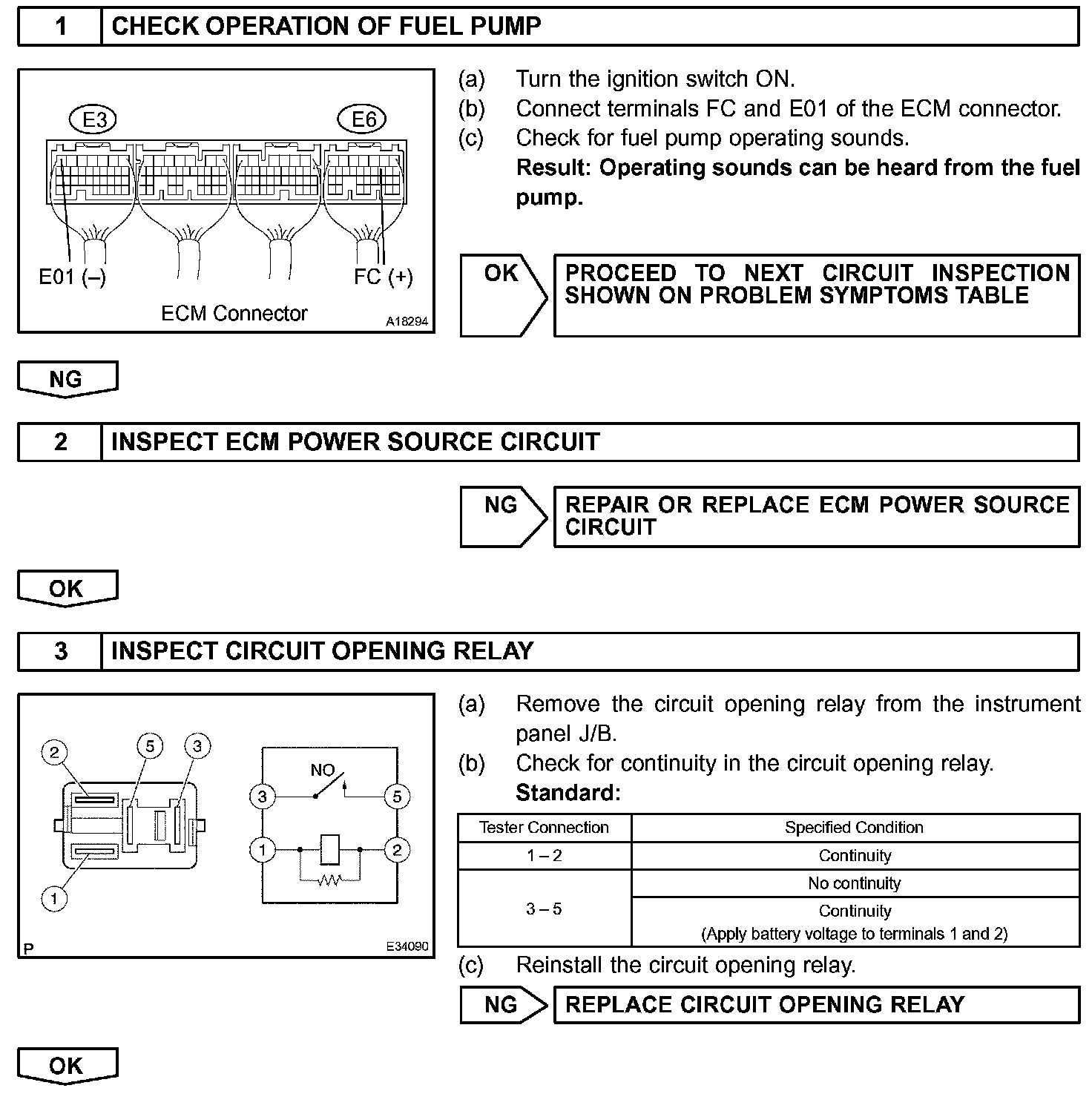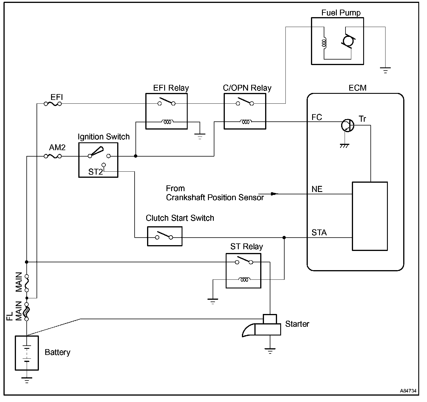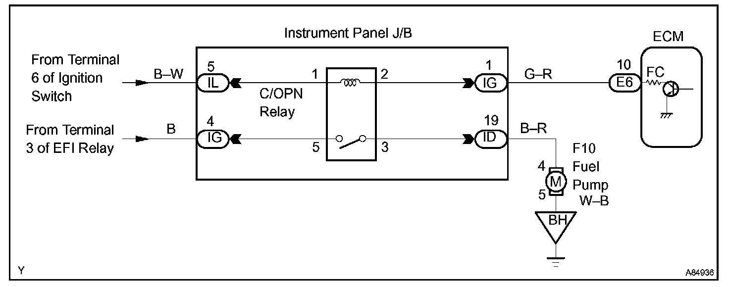 When the STA signal and NE signal are input to the ECM, Tr is turned ON, current flows to the coil of the circuit opening relay (marked: C/OPN), the relay switches on, power is supplied to the fuel pump and the fuel pump operates.
