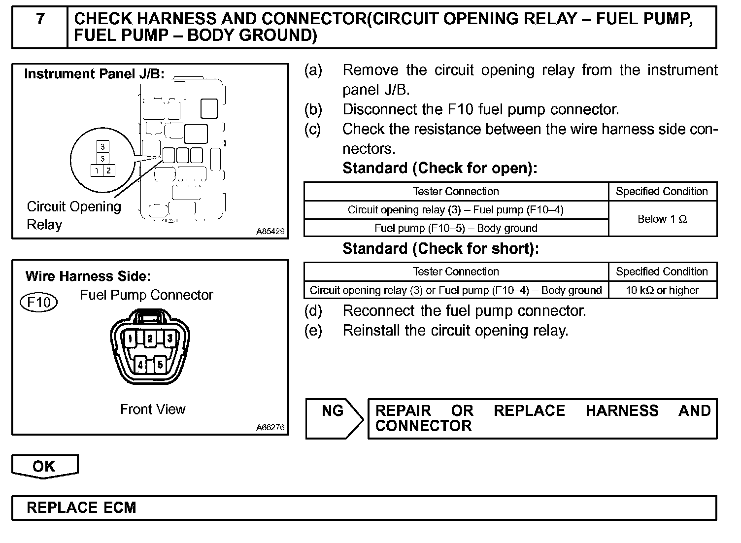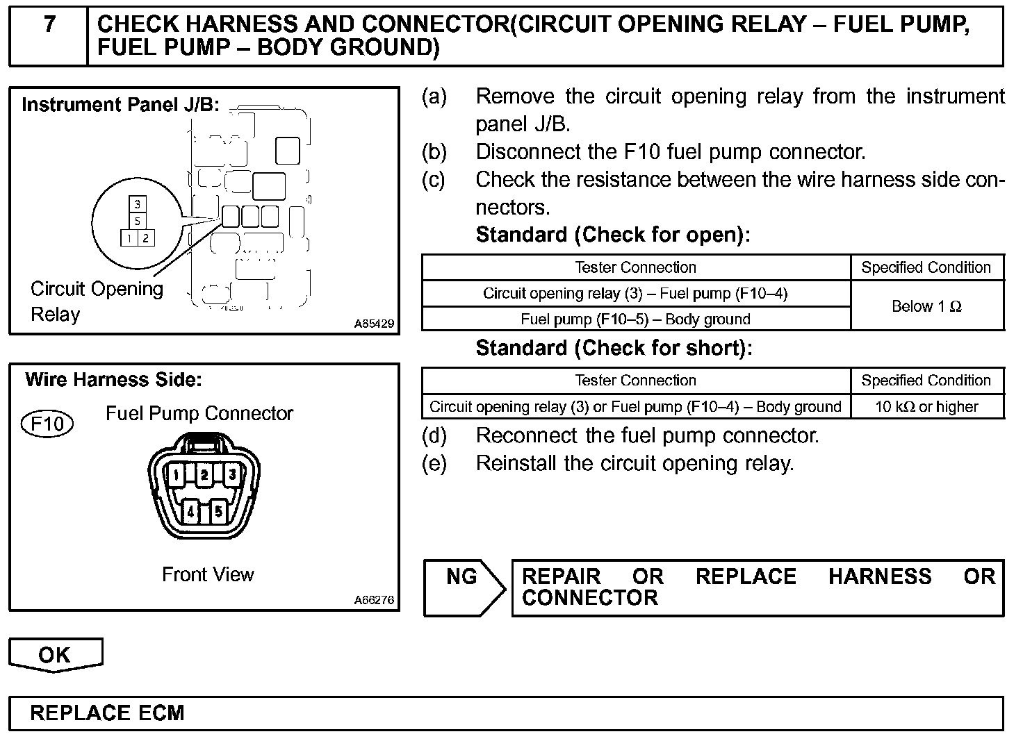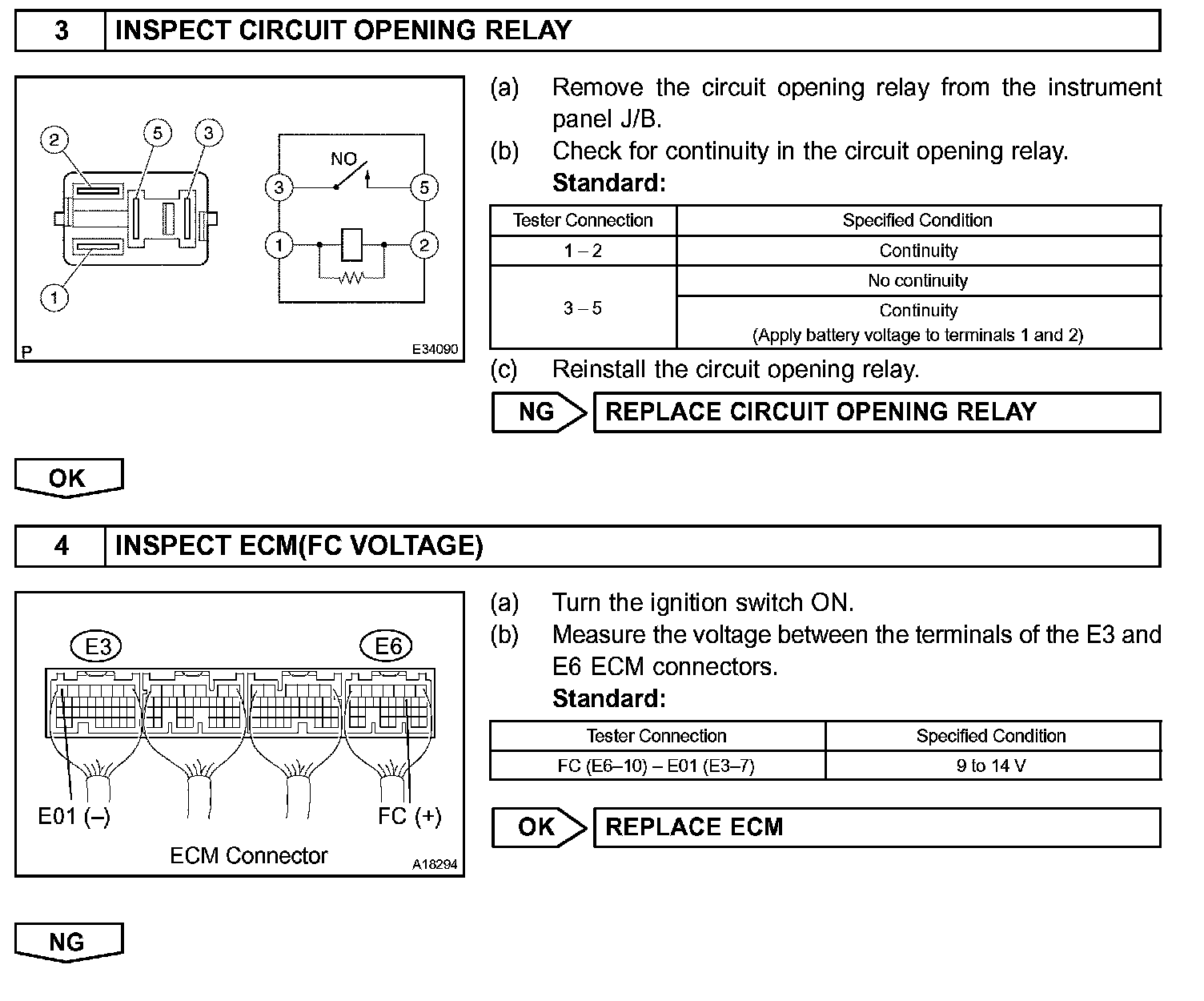 When the STA signal and NE signal are input to the ECM, Tr is turned ON, current flows to the coil of the circuit opening relay (marked: C/OPN), the relay switches on, power is supplied to the fuel pump and the fuel pump operates.