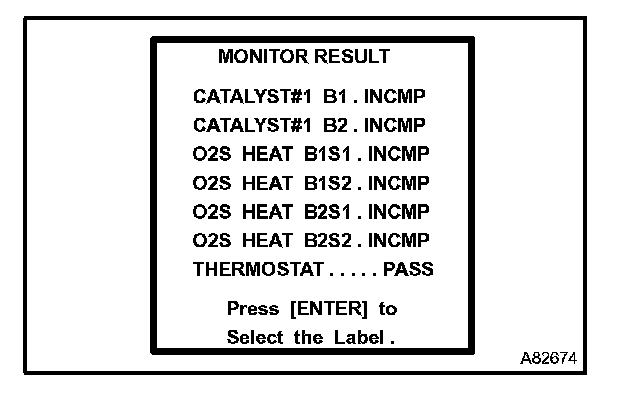 b. Enter "MONITOR RESULT" from "DIAGNOSIS/ENHANCED OBD II/MONITOR INFO/MONITOR RESULT" on the hand-held tester. You will see "Test ID" and "INCMP", "Pass" or "Fail" on the MONITOR RESULT screen.
