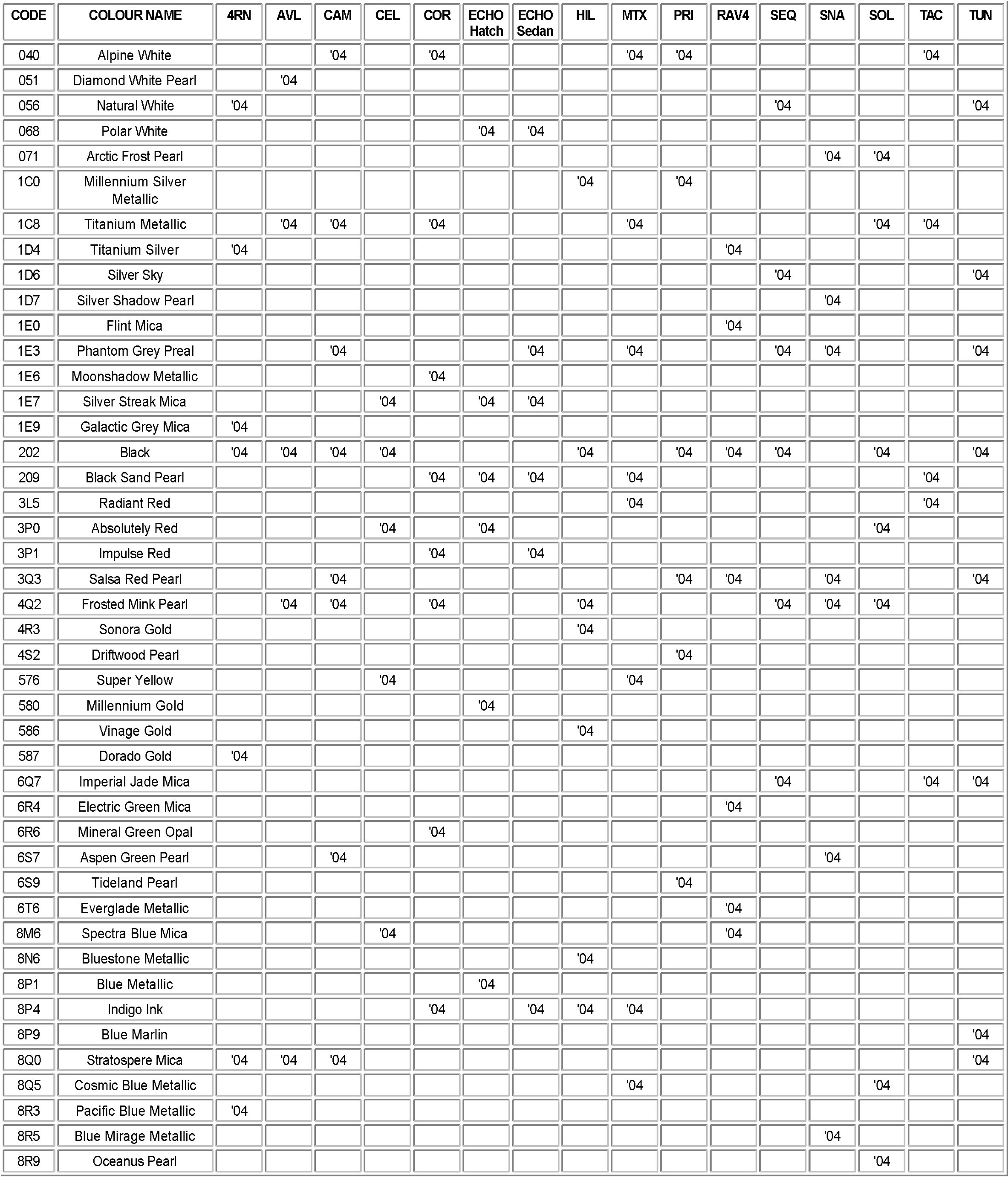Attached, for your reference, is a list of OEM paint codes for all 2004 model year vehicles.