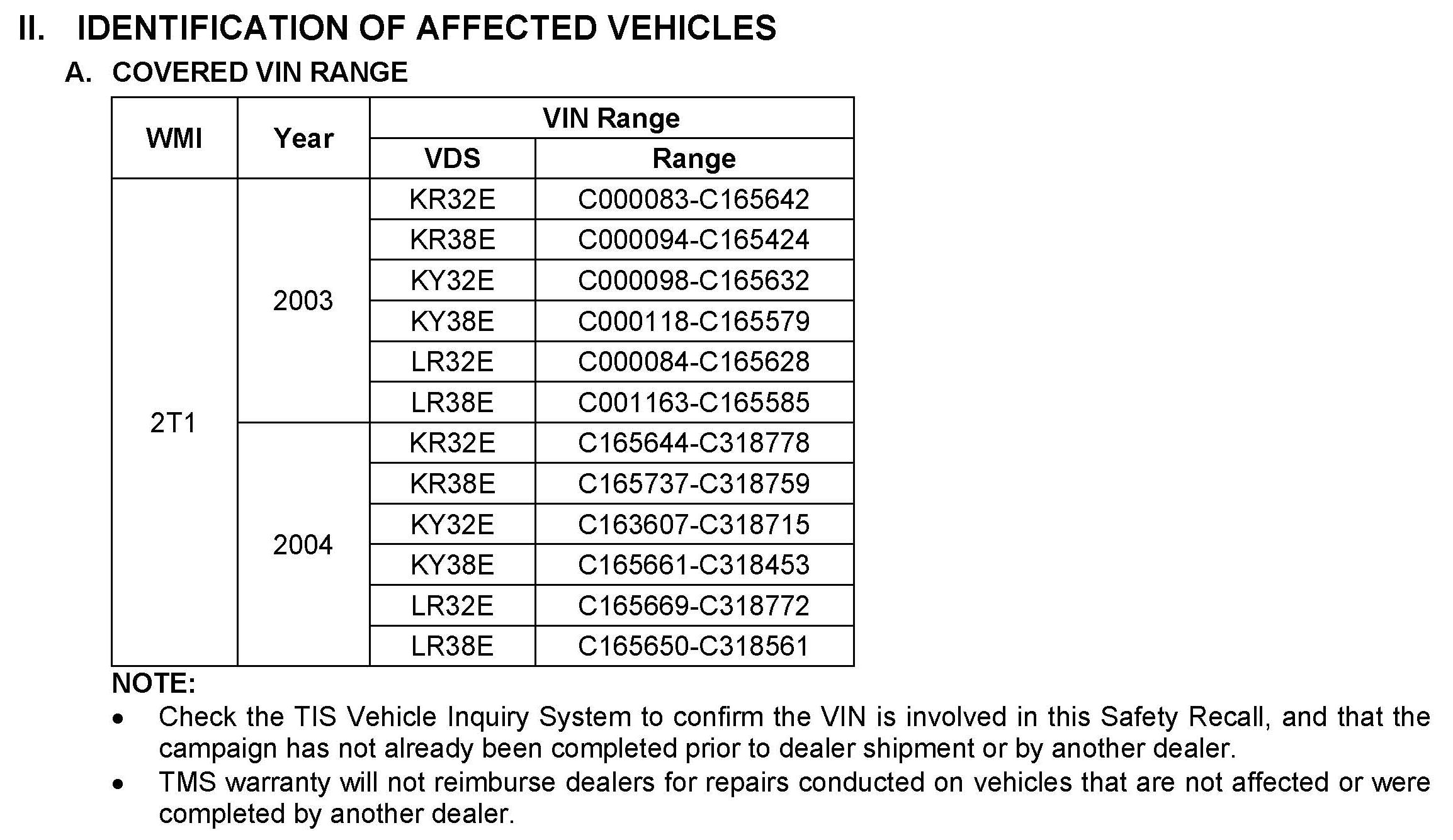 II. Identification of Affected Vehicles 2003-2004 Matrix