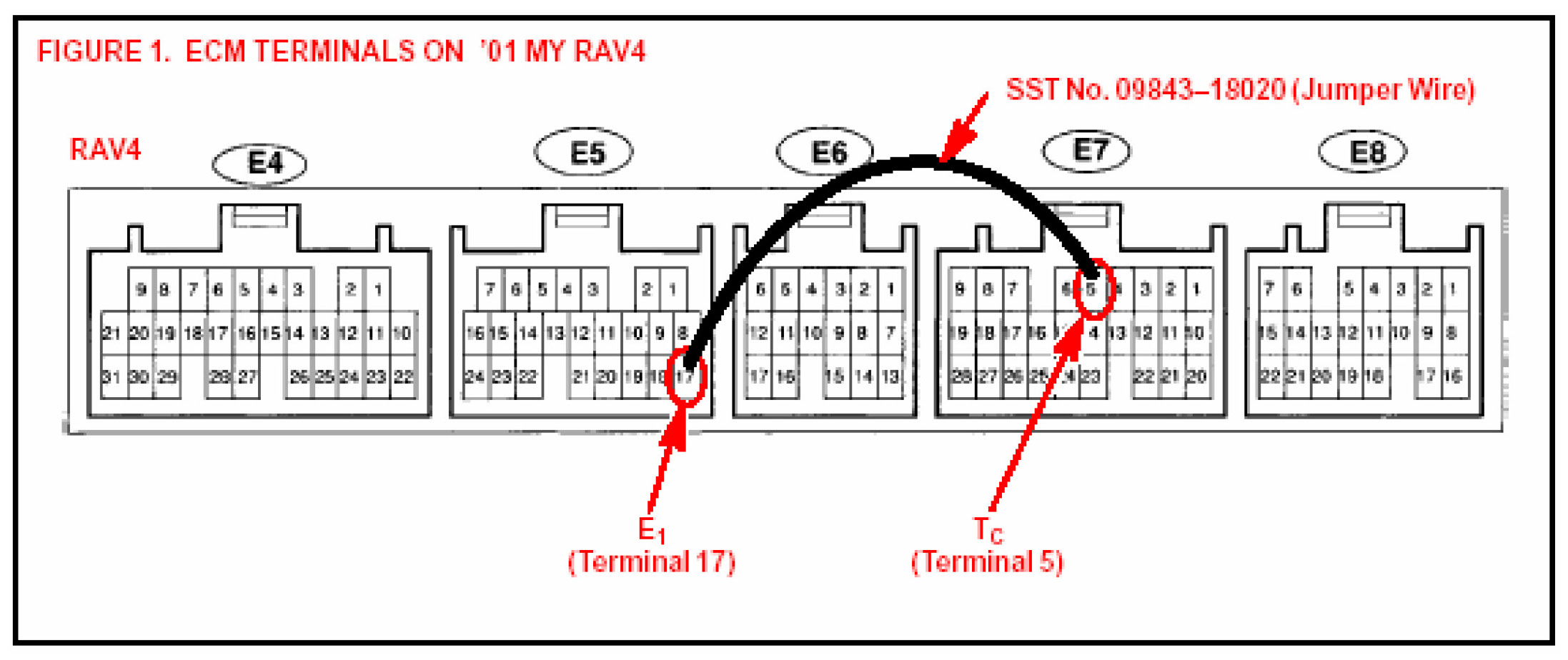Before beginning the Key Code Reset function on 2001 MY RAV4 vehicles, it is necessary to short terminals T C to E 1 at the ECM connector, using SST No. 09843-18020. (Refer to Figure 1.)
