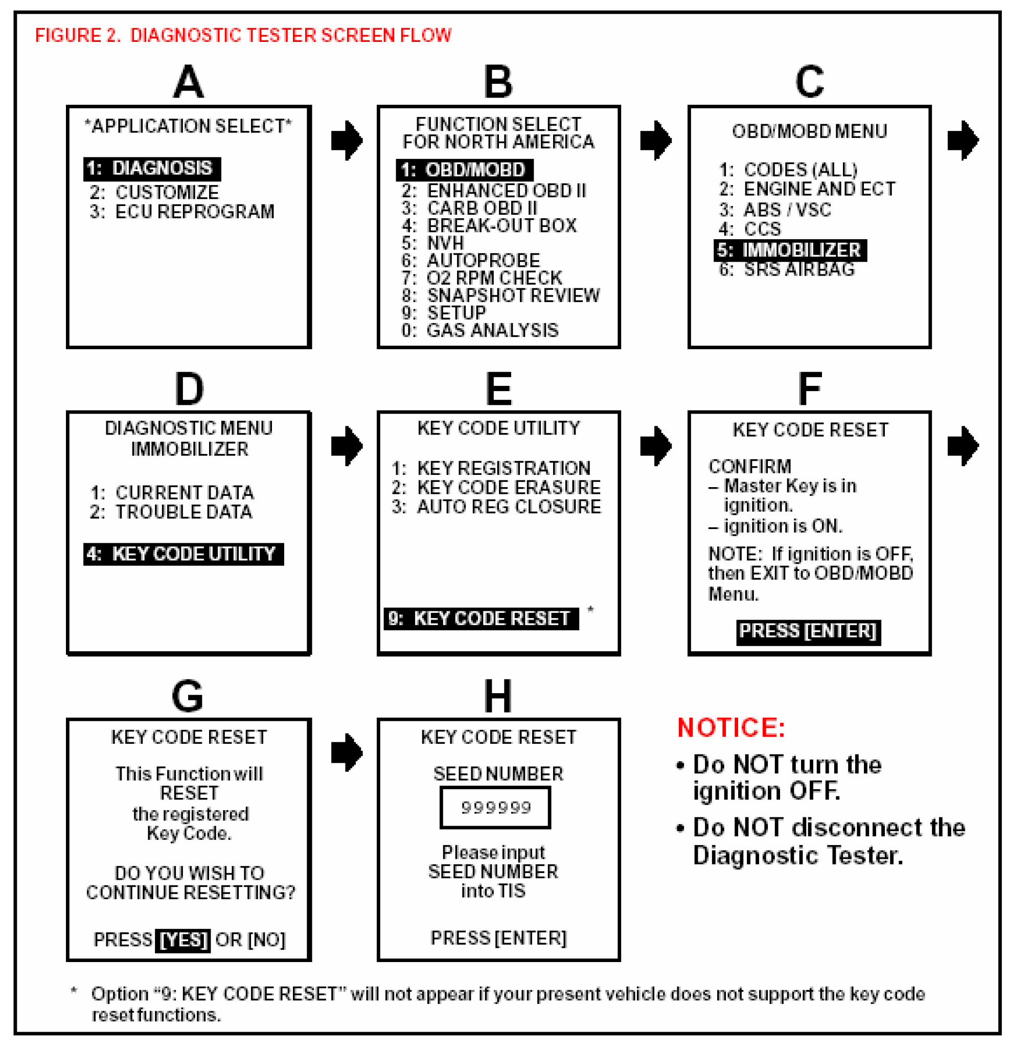 1. Using the Diagnostic Tester, follow the screen flow in Figure 2 to retrieve the "Seed Number." (DO NOT DISCONNECT the Diagnostic Tester from the vehicle during this process.).
