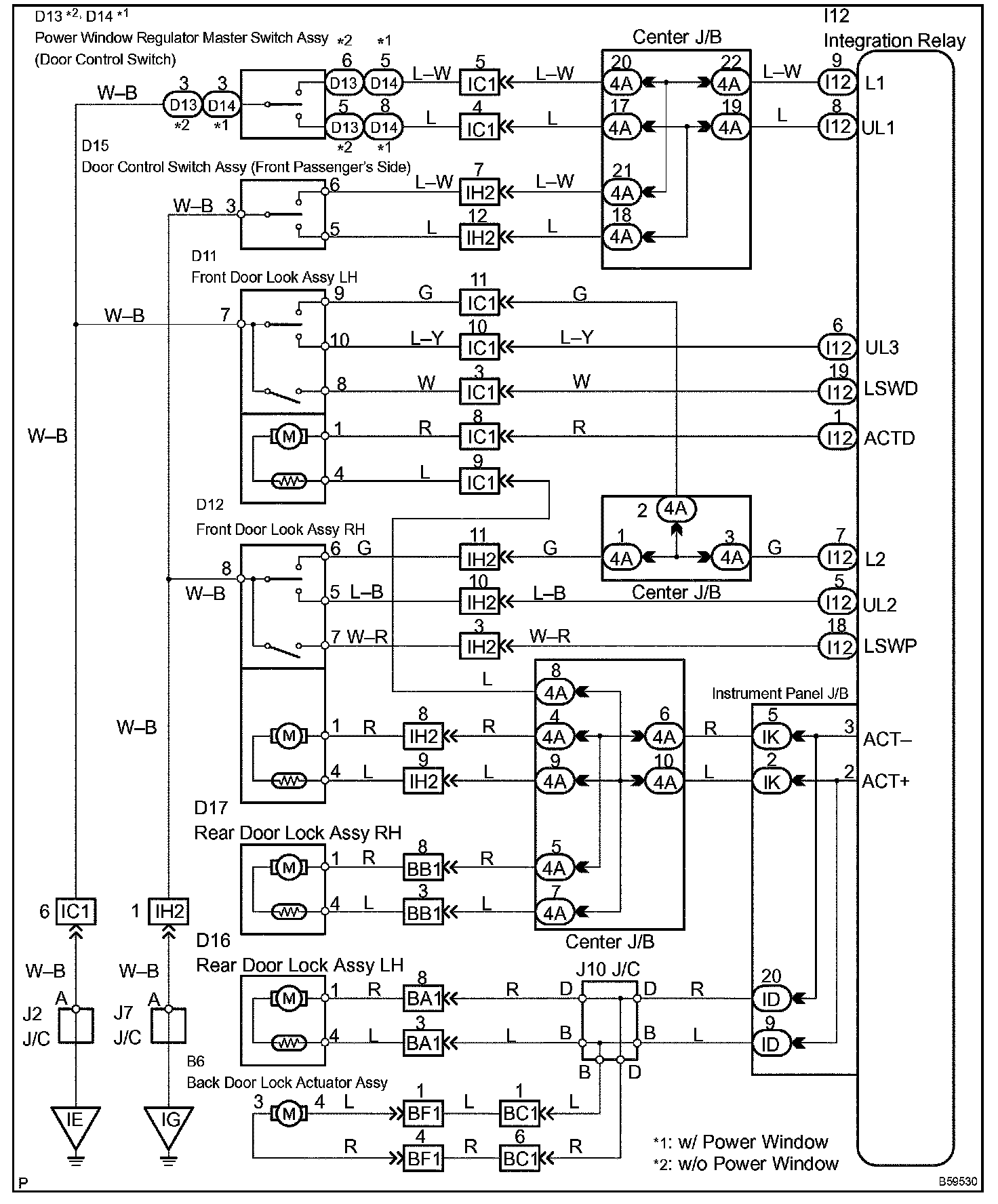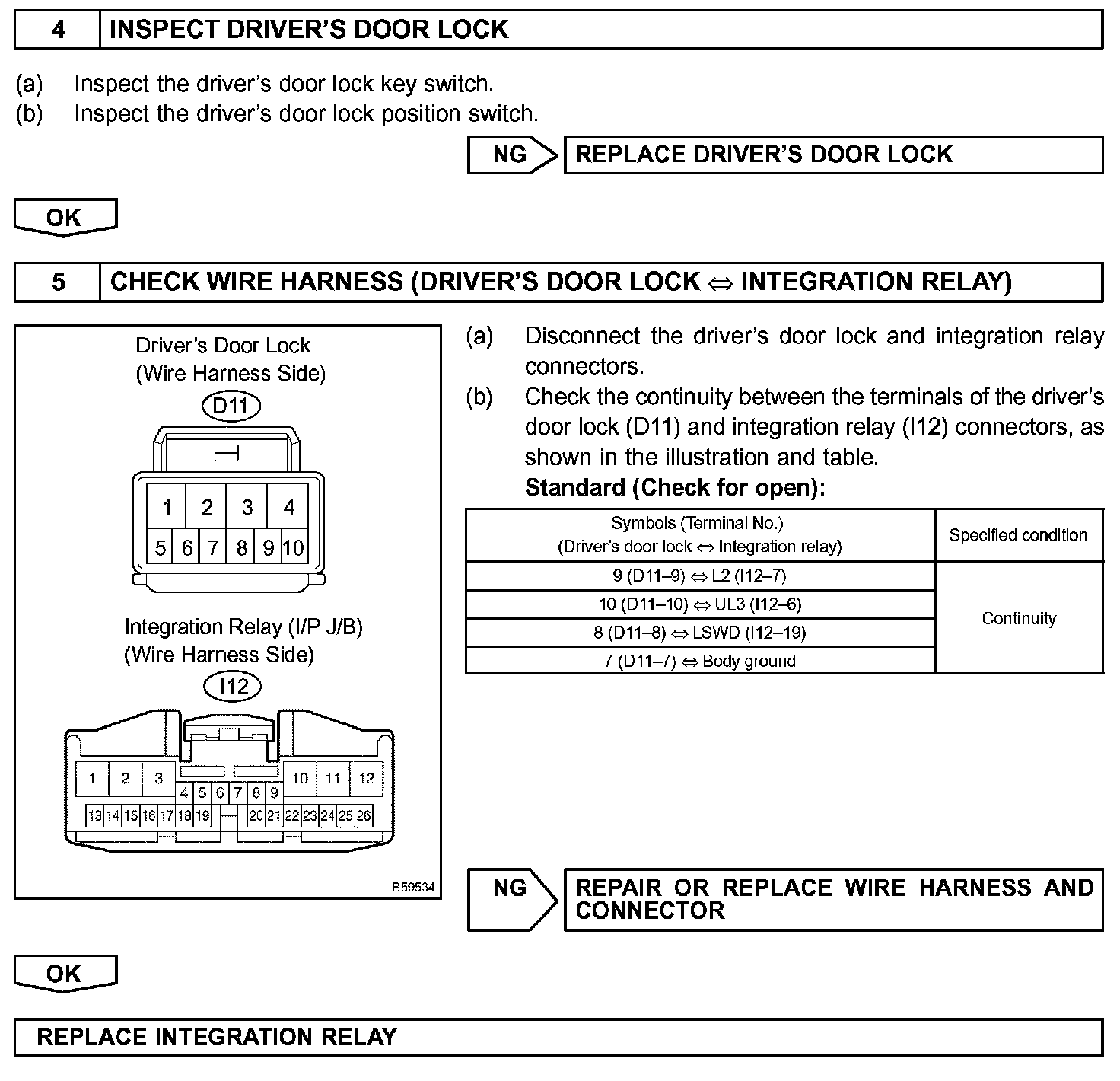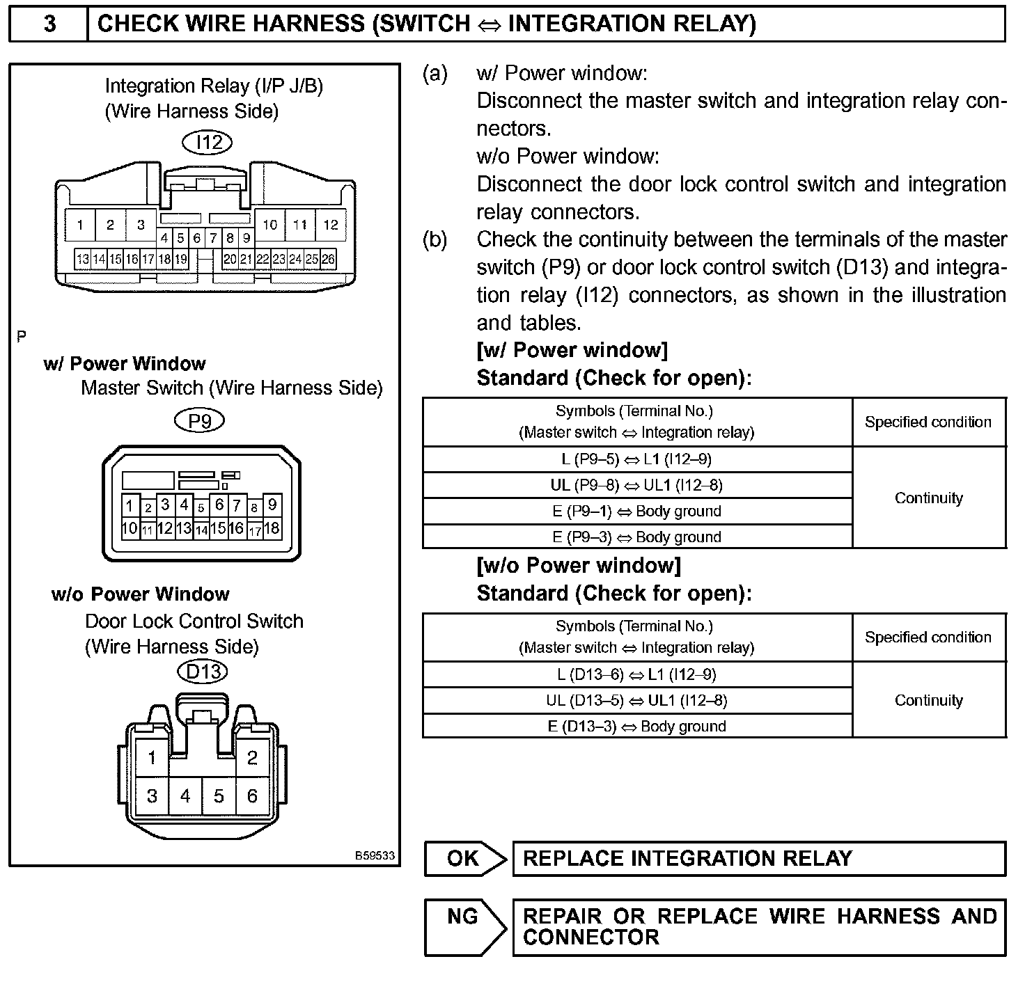 The integration relay receives a switch signal from the master switch, door lock control switch or the driver's door key and then drives the door lock motor.
