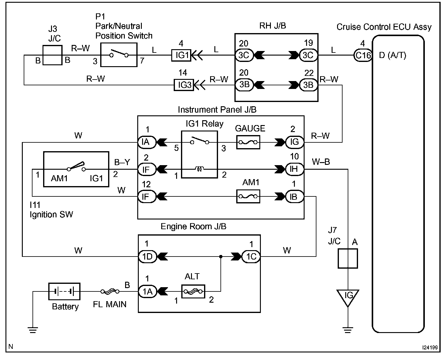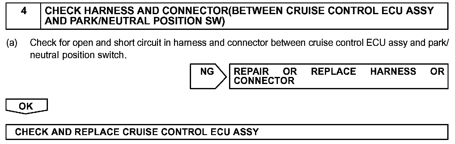 CIRCUIT DESCRIPTIONWhen the shift position is put in except D position, a signal is sent from the park/neutral position switch to the cruise control ECU assy. When this signal is input during cruise control driving, the ECU cancels the cruise control.