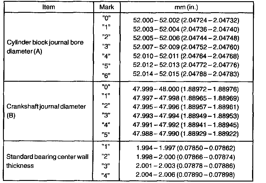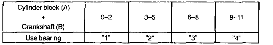 HINT: If replacing a bearing, select a new one having the same number. If the number of the bearing cannot be determined, calculate the correct use bearing number by adding together the numbers imprinted on the cylinder block and crankshaft, then select a new bearing having the calculated number. There are 4 sizes of standard bearings, marked "1", "2", "3" and "4" accordingly.
