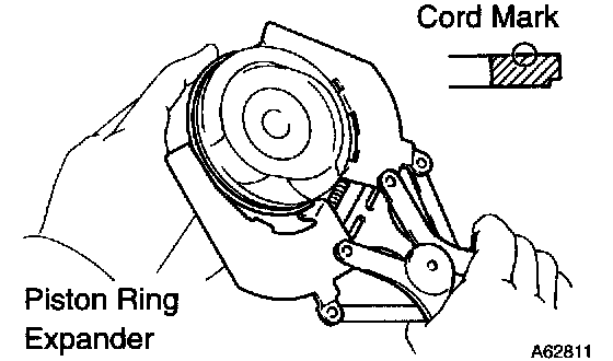 b. Using a piston ring expander, install the 2 compression rings with the code mark facing upward.