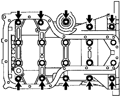 j. Uniformly loosen the 10 bearing cap bolts, in several passes, in the sequence shown in the illustration.