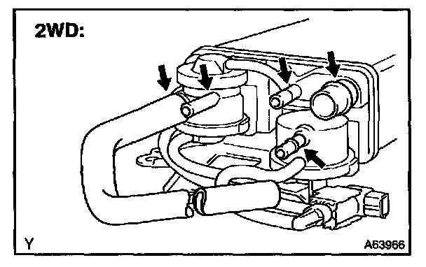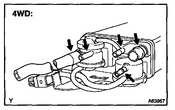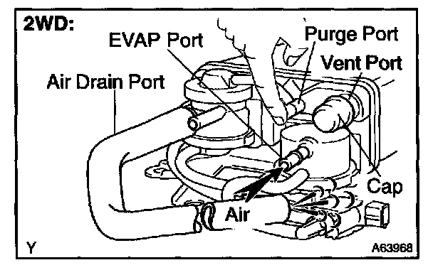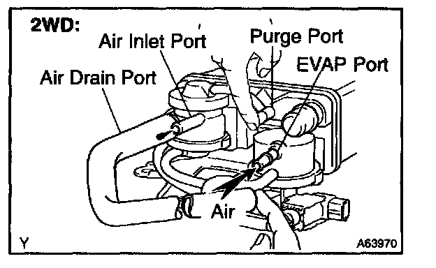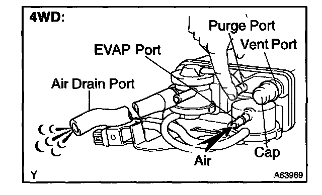 5. While holding the air inlet port closed, apply vacuum (3.43 kPa, 25.7 mmHg, 1.01 in.Hg) to the EVAP port and check that air flows into the purge port.