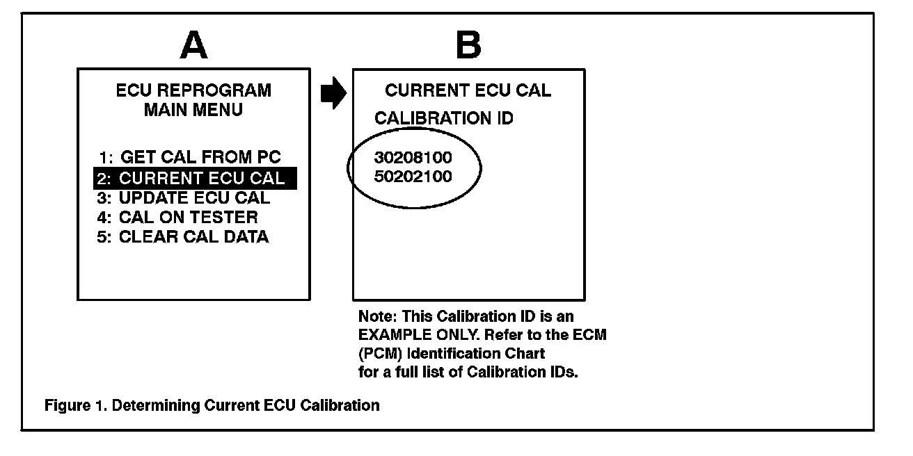 2. Connect the Diagnostic Tester to the vehicle and select "CURRENT ECU CAL" from the ECU REPROGRAM MAIN MENU." To determine the vehicle's current ECM calibration, see Figure 1 shown.