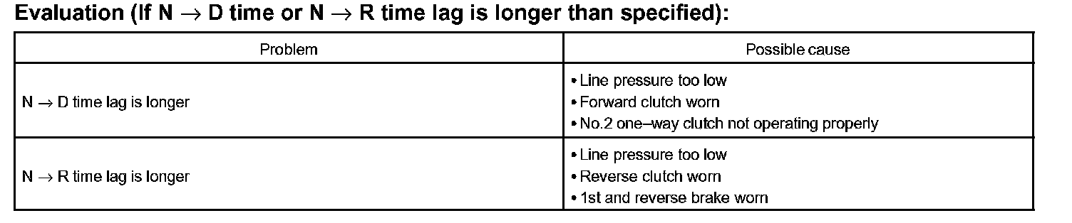 When the shift lever is shifted while the engine is idling, there will be a certain time lapse or lag before the shock can be felt. This is used for checking the conditions of the No.2 one-way clutch, reverse clutch, forward clutch, and 1st and reverse brake.