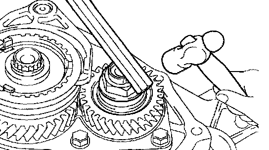 c. Using a chisel and a hammer, stake the manual transmission output shaft rear set nut.