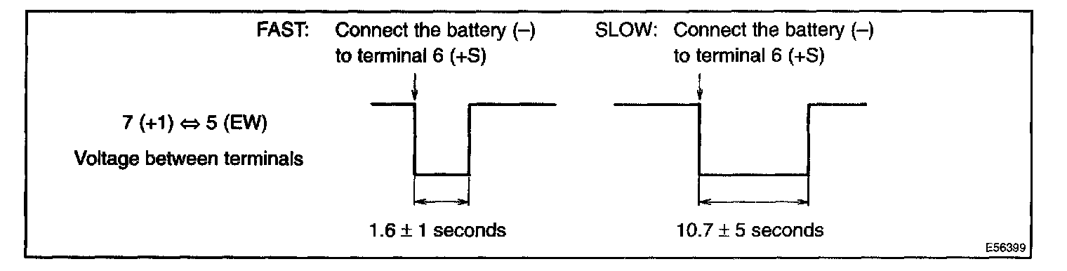 5. Connect the battery (-) to terminal 6 (+S) of the connector. Operate the intermittent wiper relay and check voltage between terminal 7 (+1) and terminal 5(EW).
