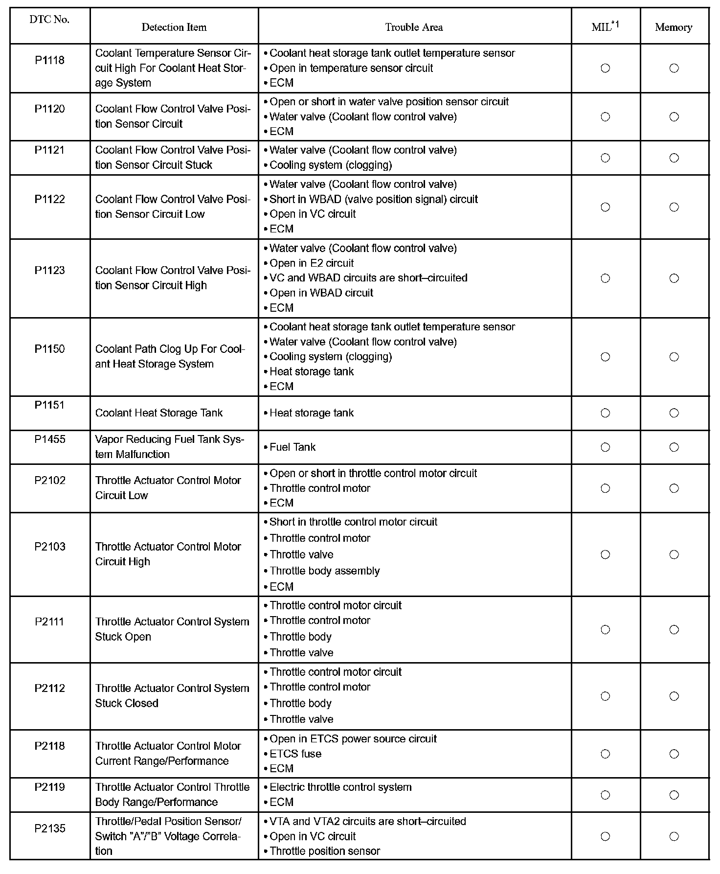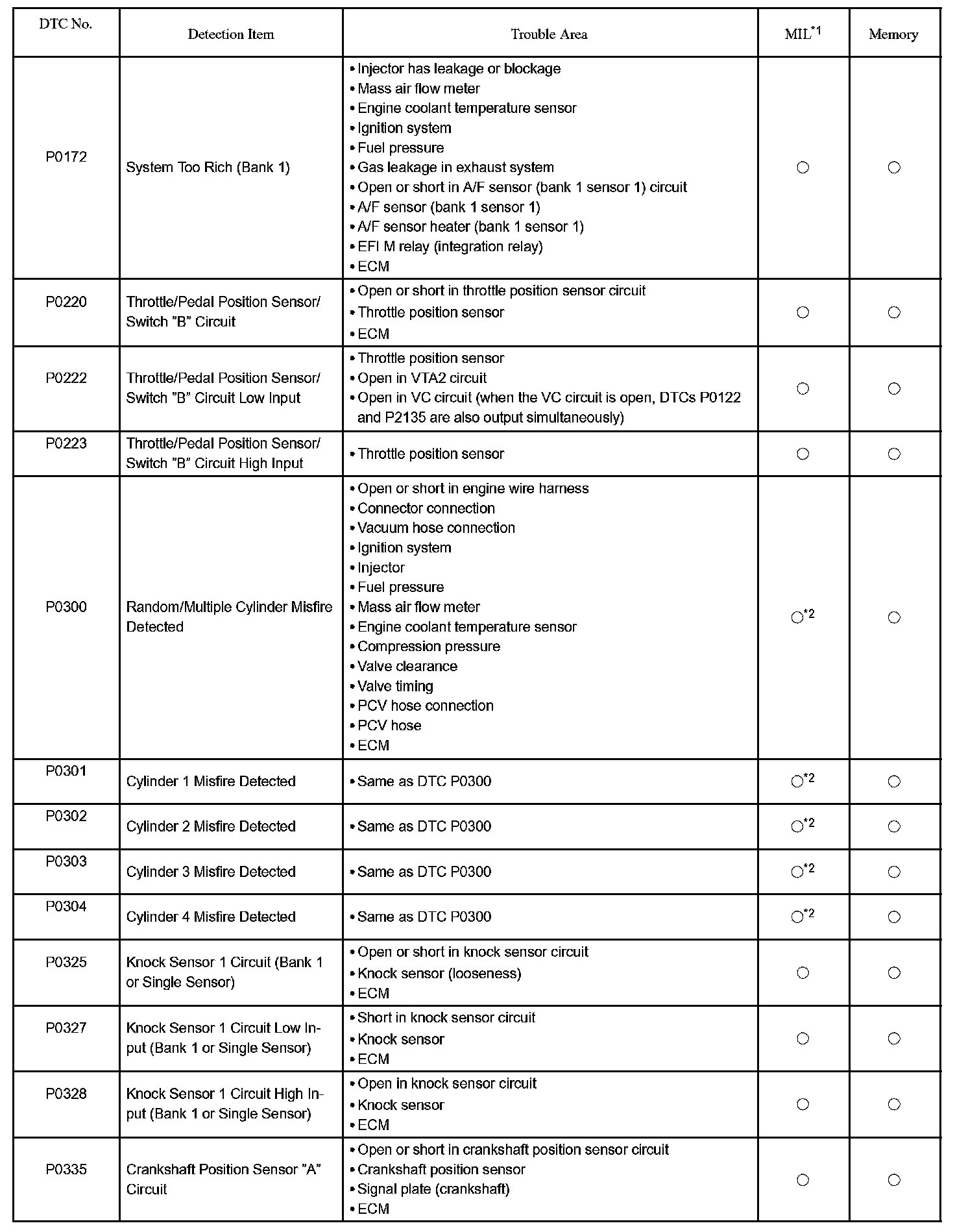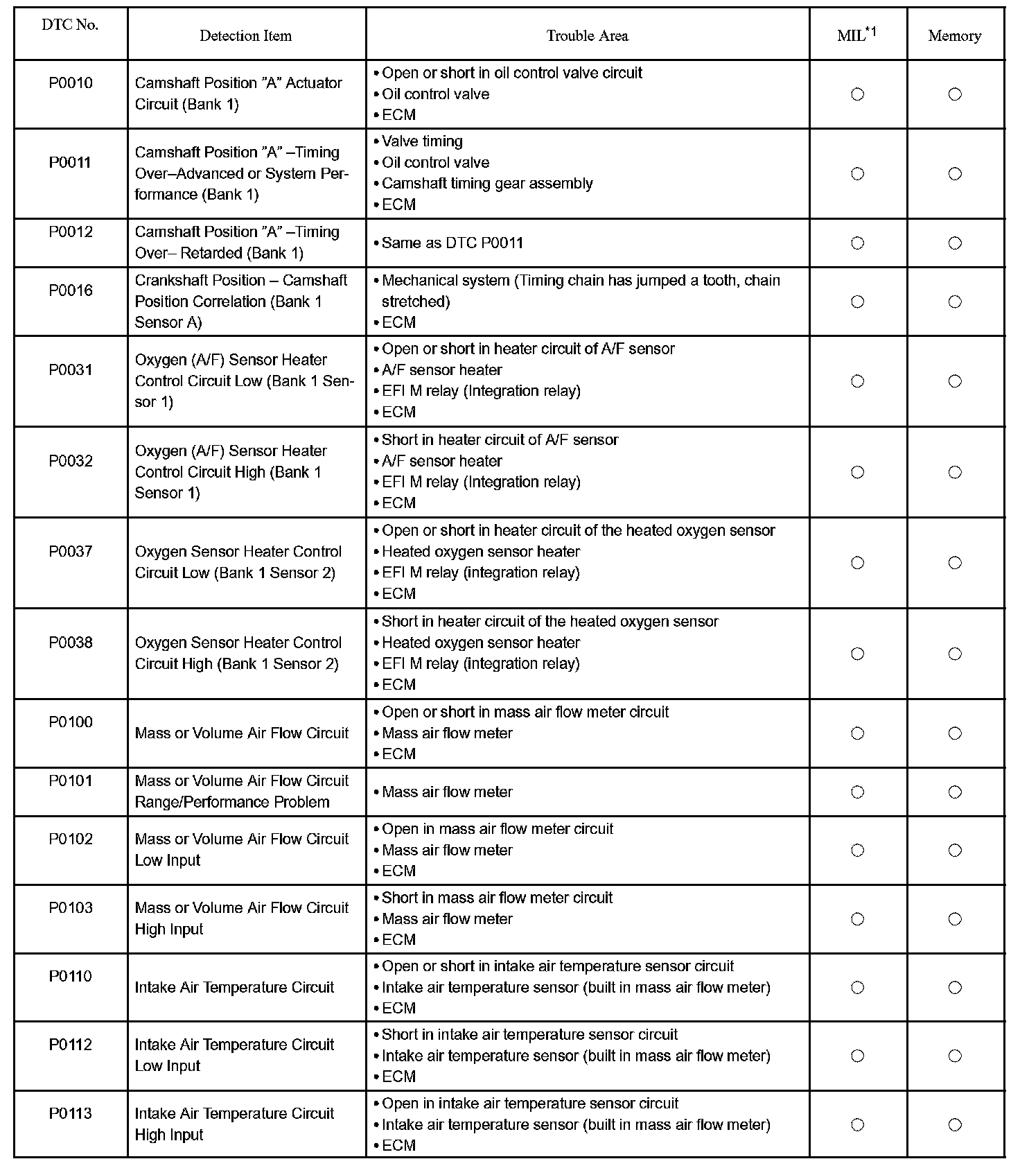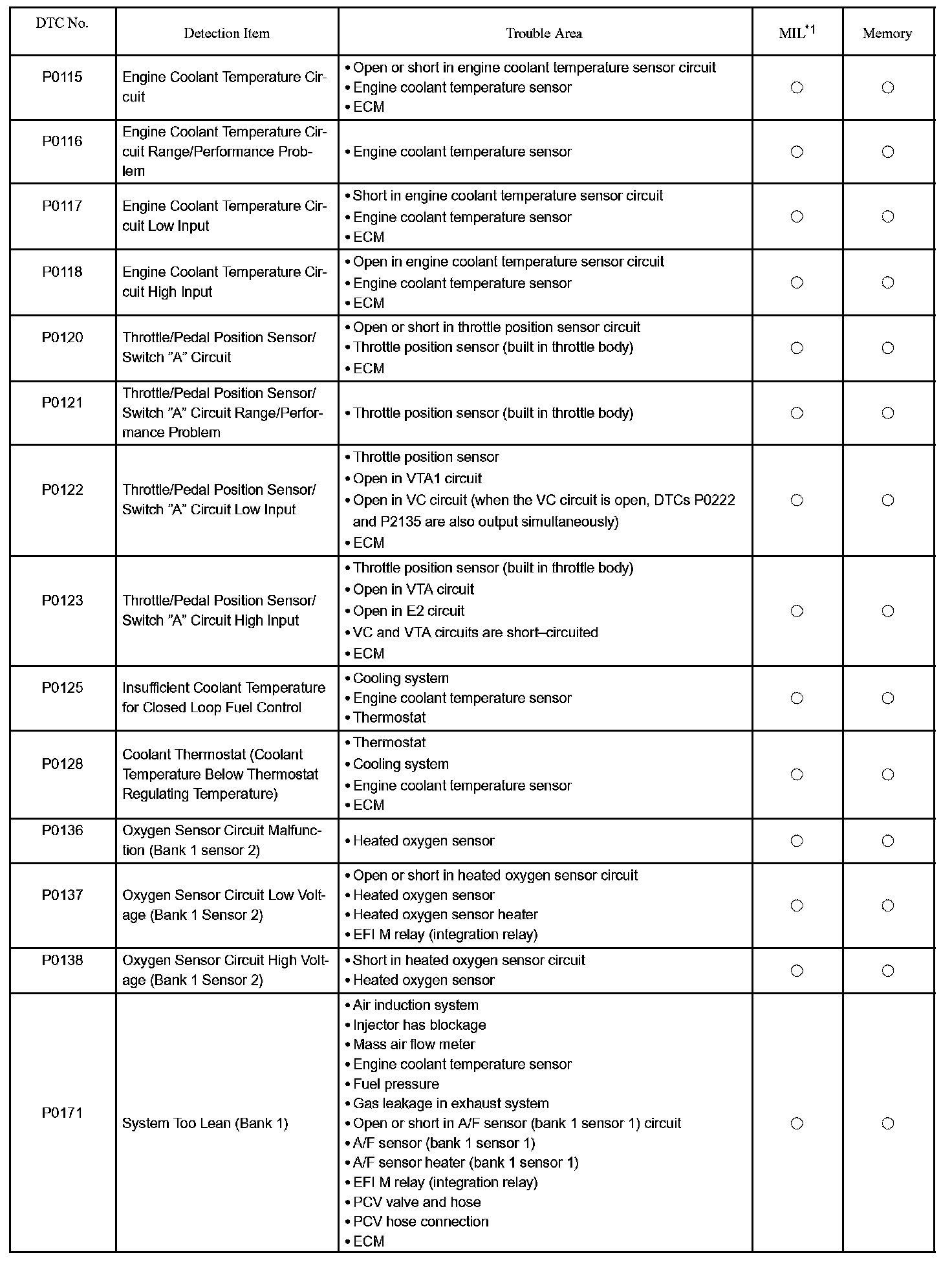 If a malfunction code is displayed during the DTC check in check mode, check the circuit for the codes listed in the table. For details of each code, refer to the respective "DTC No." under "Trouble Code Diagnostic Charts."