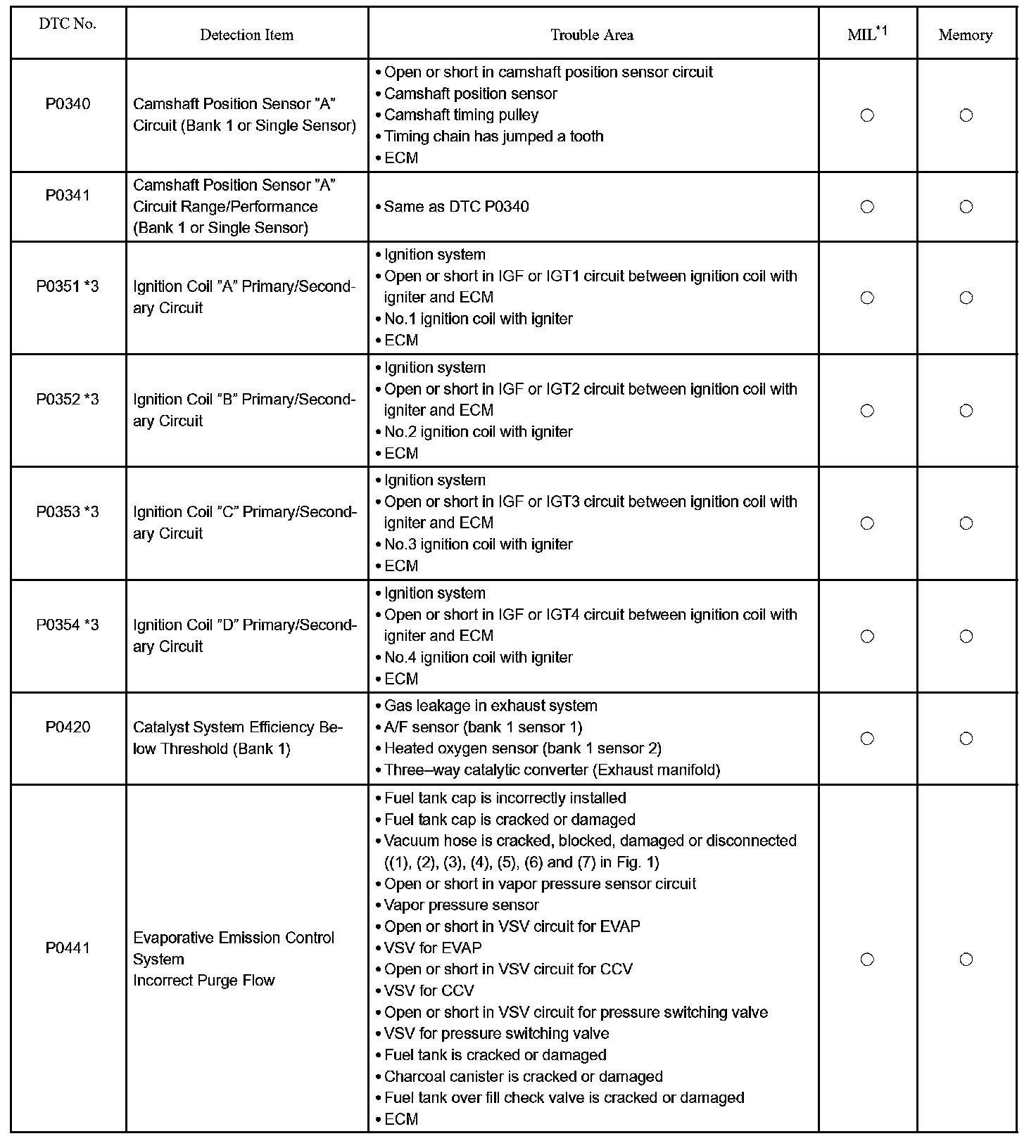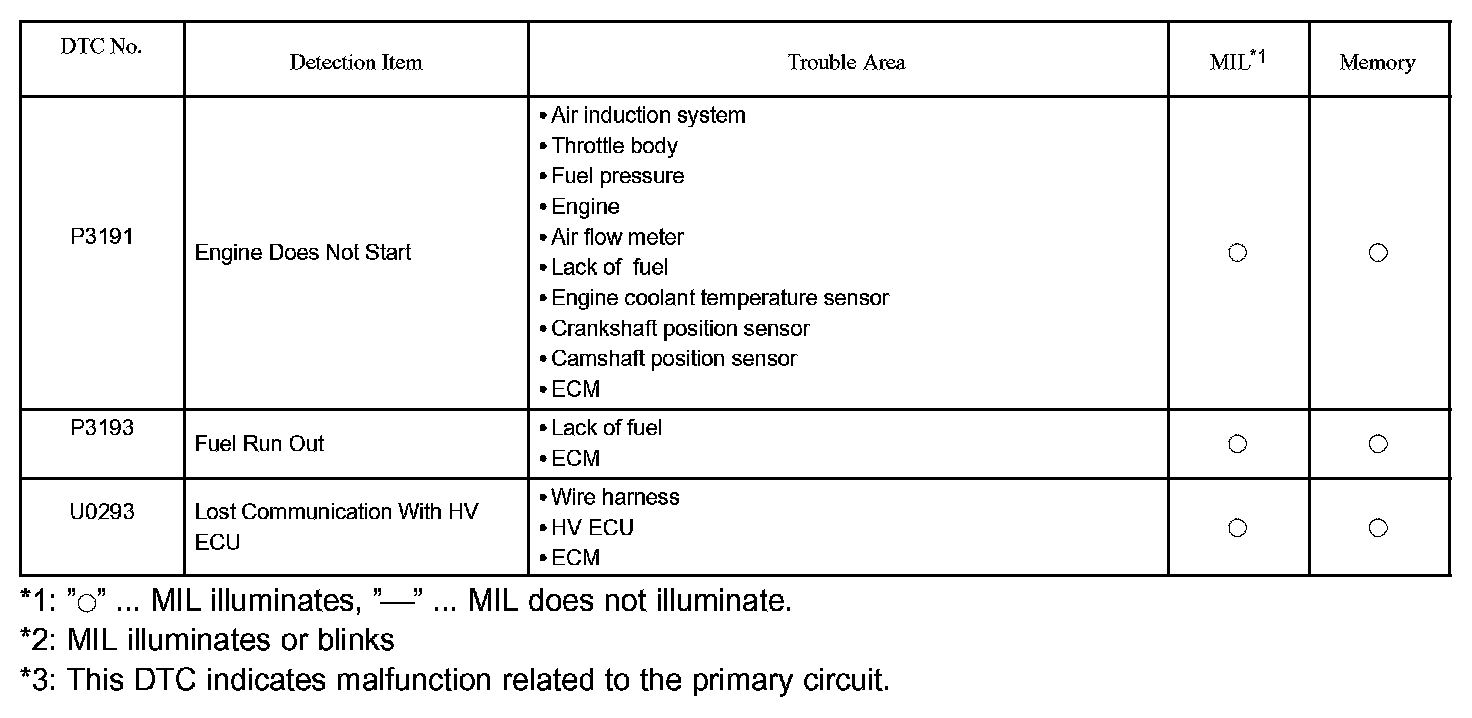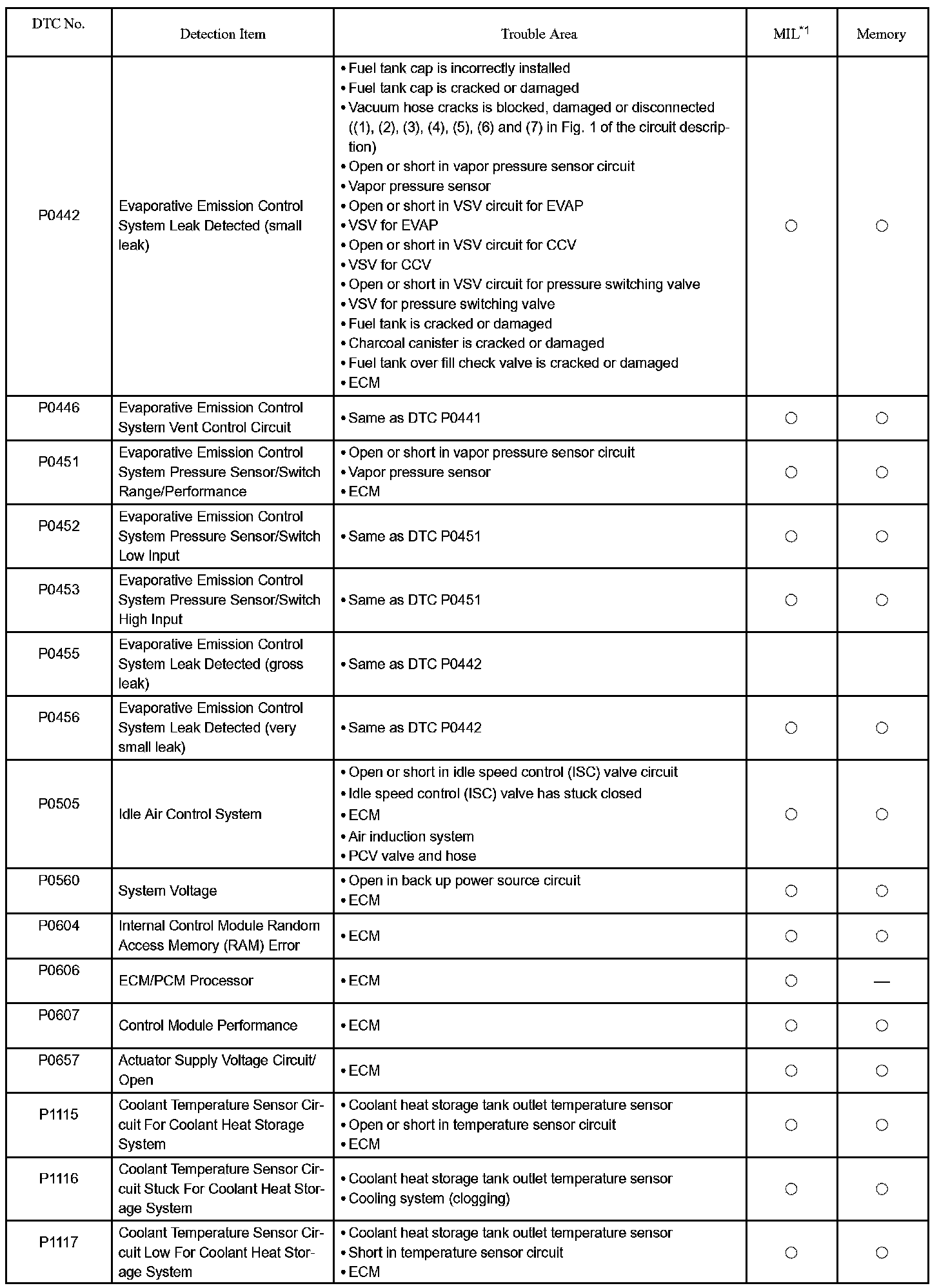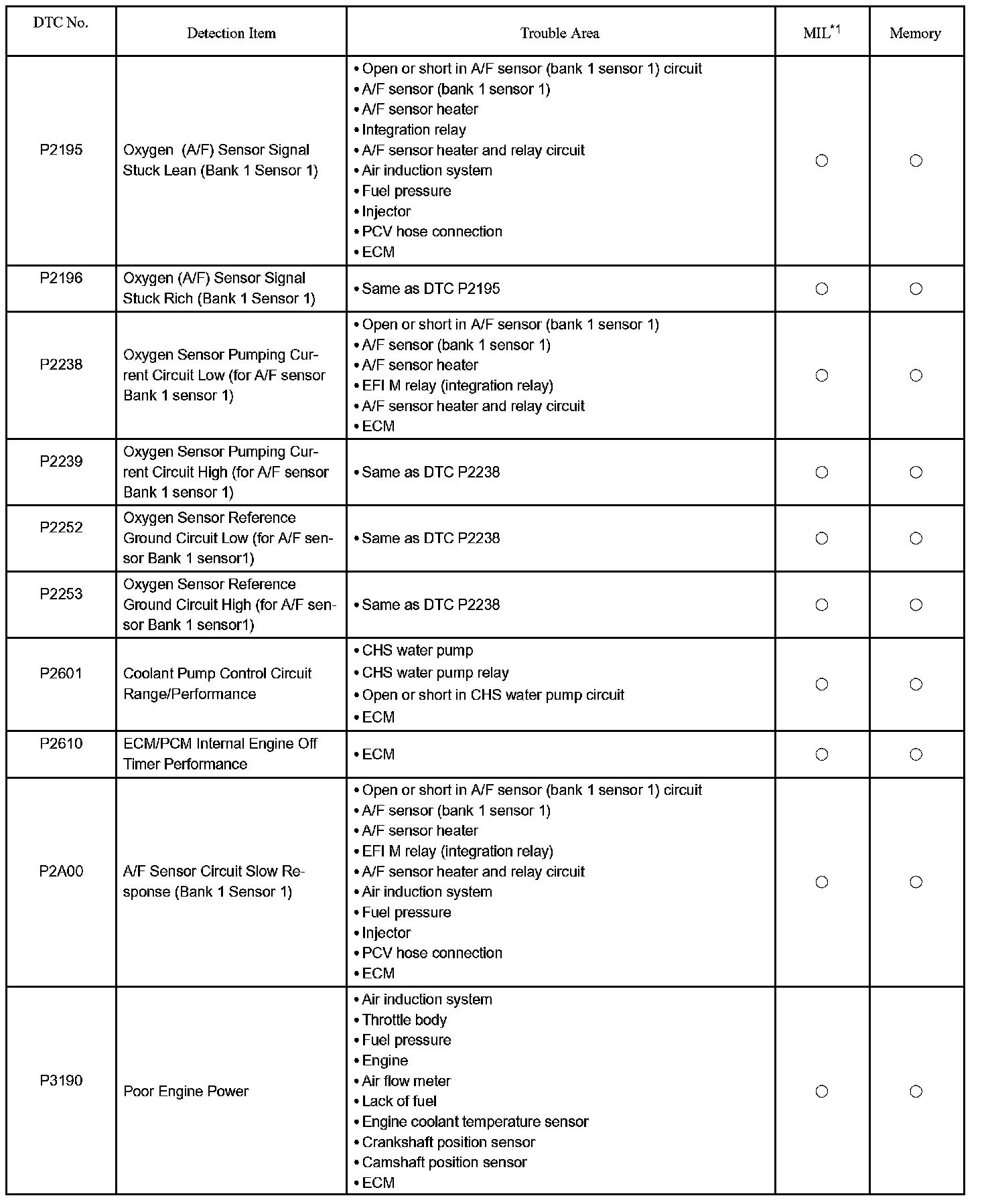 If a malfunction code is displayed during the DTC check in check mode, check the circuit for the codes listed in the table. For details of each code, refer to the respective "DTC No." under "Trouble Code Diagnostic Charts."