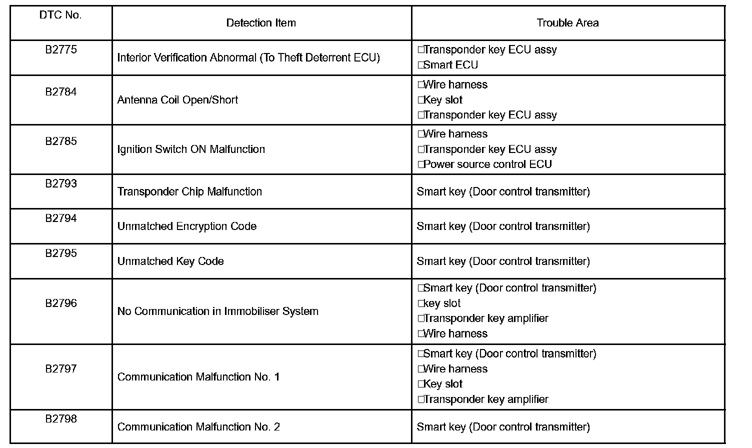 DIAGNOSTIC TROUBLE CODE CHARTB2775 - B2798: