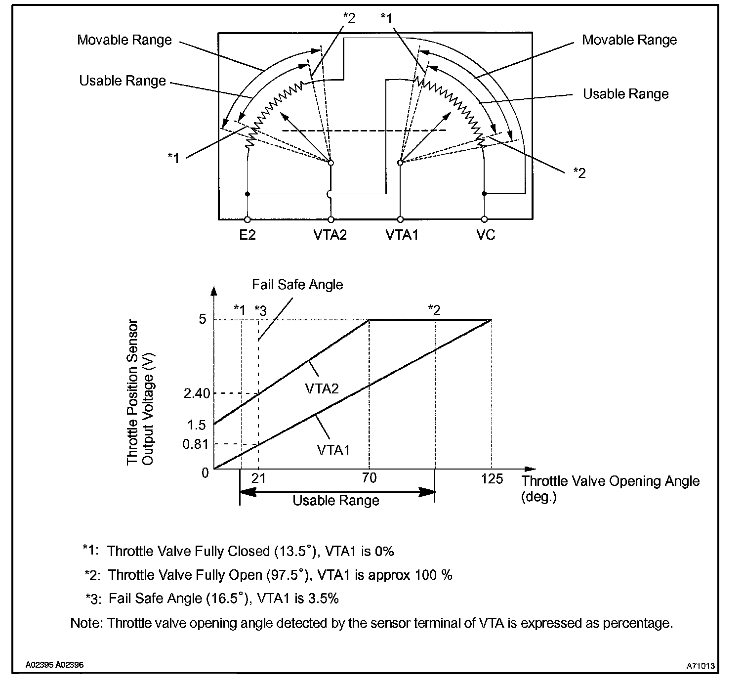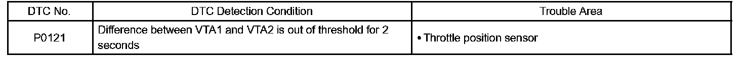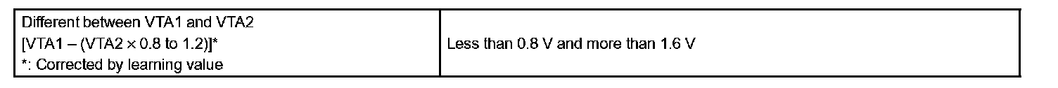 There is a specific voltage difference between VTA1 and VTA2 for each throttle opening angle. If VTA1 or VTA2 is out of the normal operating range, the ECM interprets this as a fault and will set a DTC. If VTA1 is within 0.02 V of VTA2, the ECM interprets this as a short circuit in the throttle position sensor system and will set a DTC.