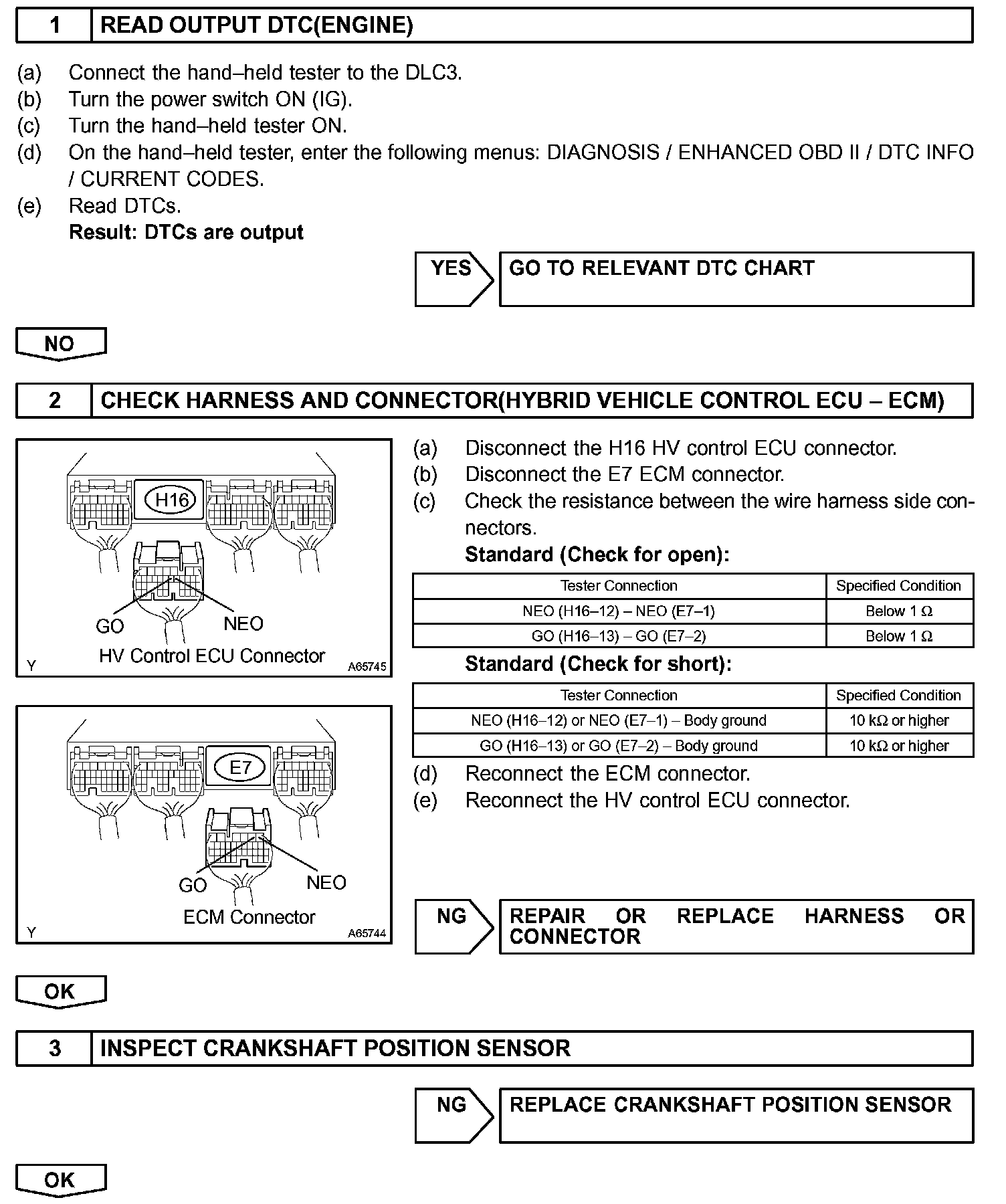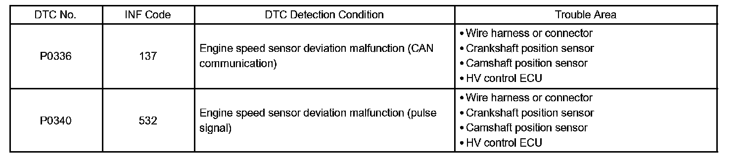 If there is any malfunction in the communication values or pulse inputs, the HV control ECU detects it by comparing the following three speeds: the engine speed transmitted by the ECM via CAN (Controller Area Network) communication, the engine speed obtained through pulse inputs, and the engine speed calculated from the MG1 and MG2 speeds.