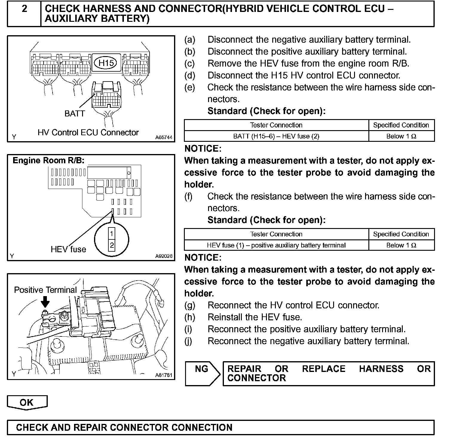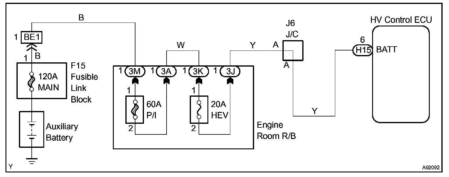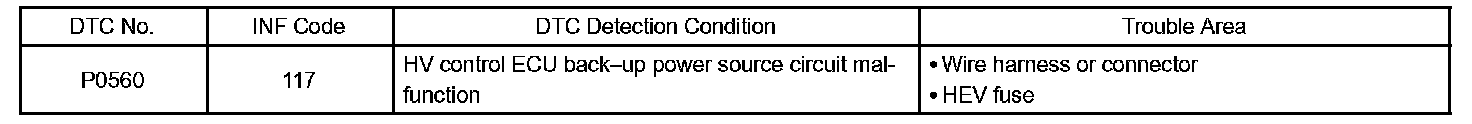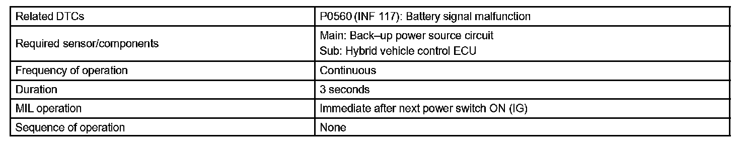 If 3 or more seconds have elapsed with a voltage of 3.3 V or less at the BATT terminal at the HV control ECU, the HV control ECU will determine that a malfunction has occurred in the back-up power supply system, and set a DTC. It will illuminate the MIL the next time the engine is started.