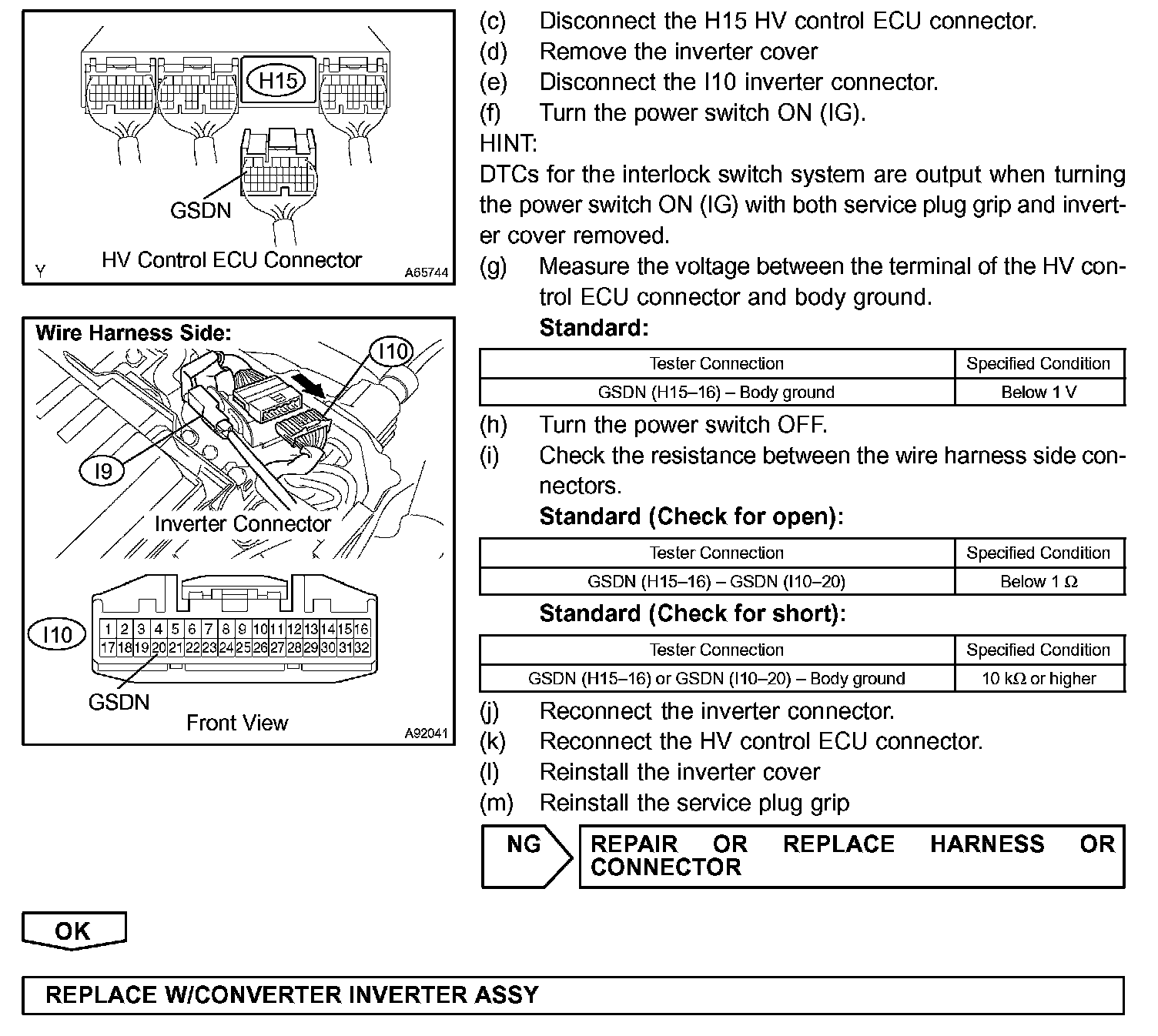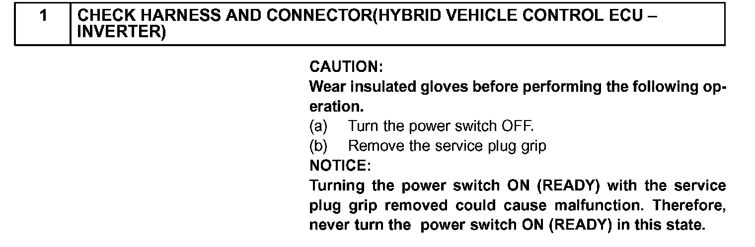 - Before inspecting the high-voltage system, take safety precautions to prevent electrical shocks, such as wearing insulated gloves and removing the service plug grip. After removing the service plug grip, put it in your pocket to prevent other technicians from reconnecting it while you are servicing the high-voltage system.