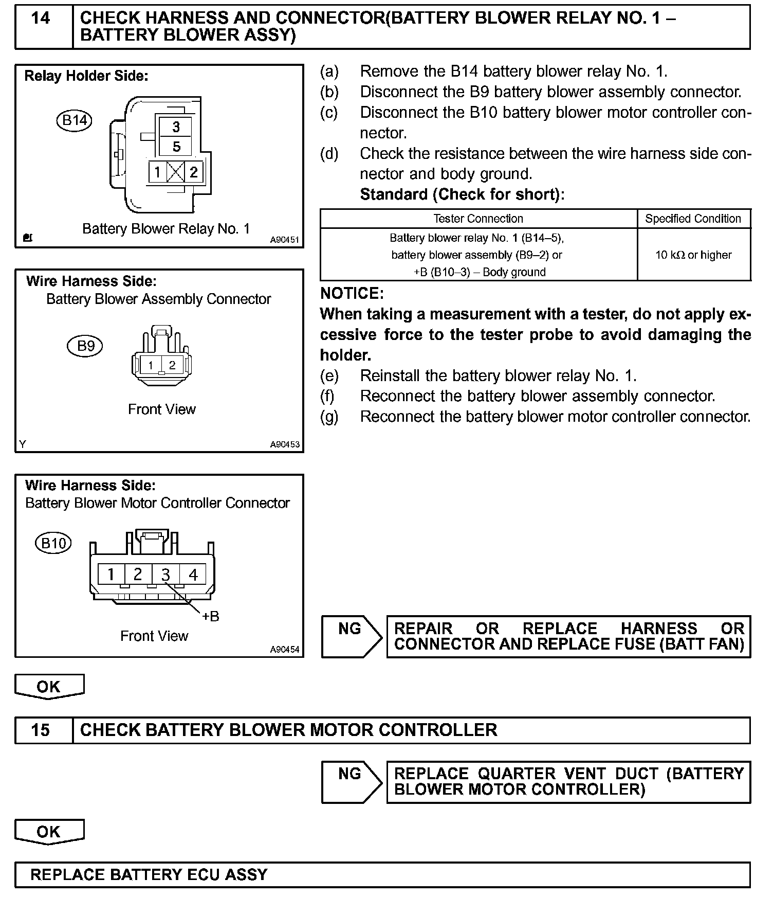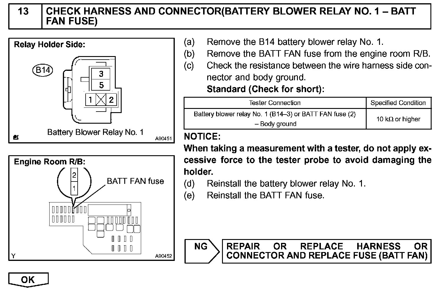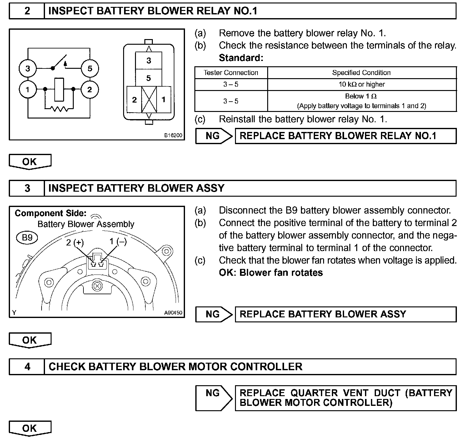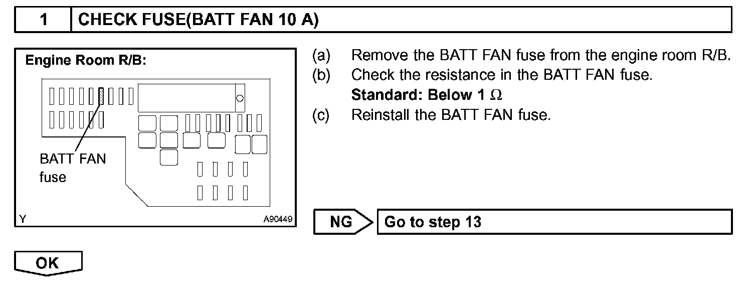 The current flows from the FCTL1 terminal of the battery ECU to the relay coil of the battery blower relay No. 1 and as the contact point of the relay closes, the power is supplied to the battery blower assembly. When a fan actuation signal is transmitted from the battery ECU, the blower motor controller adjusts voltage (VM) which is applied to the battery blower assembly in order to get the requested fan speed. The adjusted voltage is also transmitted to the VM terminal of the battery ECU in the form of a monitoring signal. The blower motor controller corrects the voltage at the blower motor by monitoring voltage at the +B terminal of the battery blower assembly.