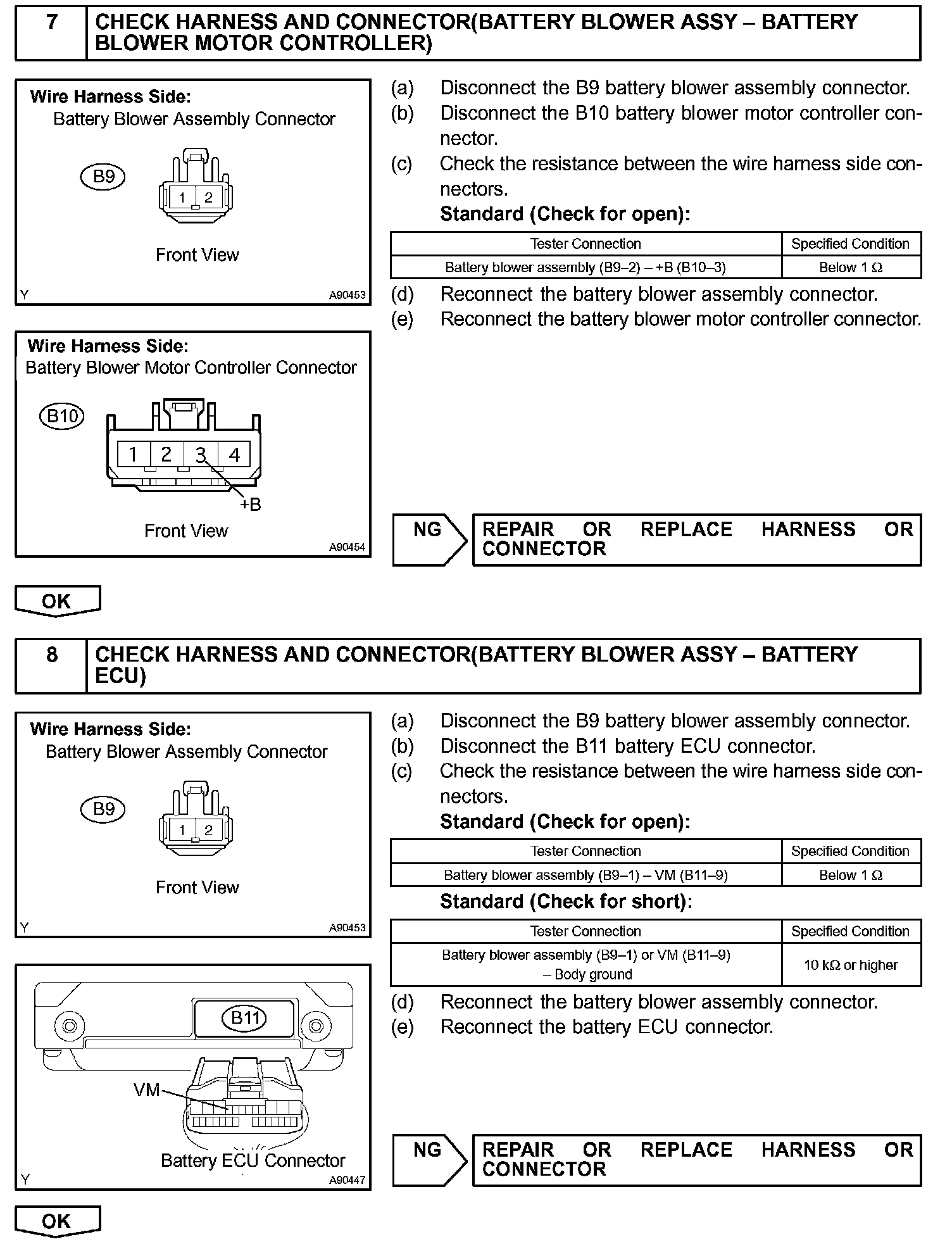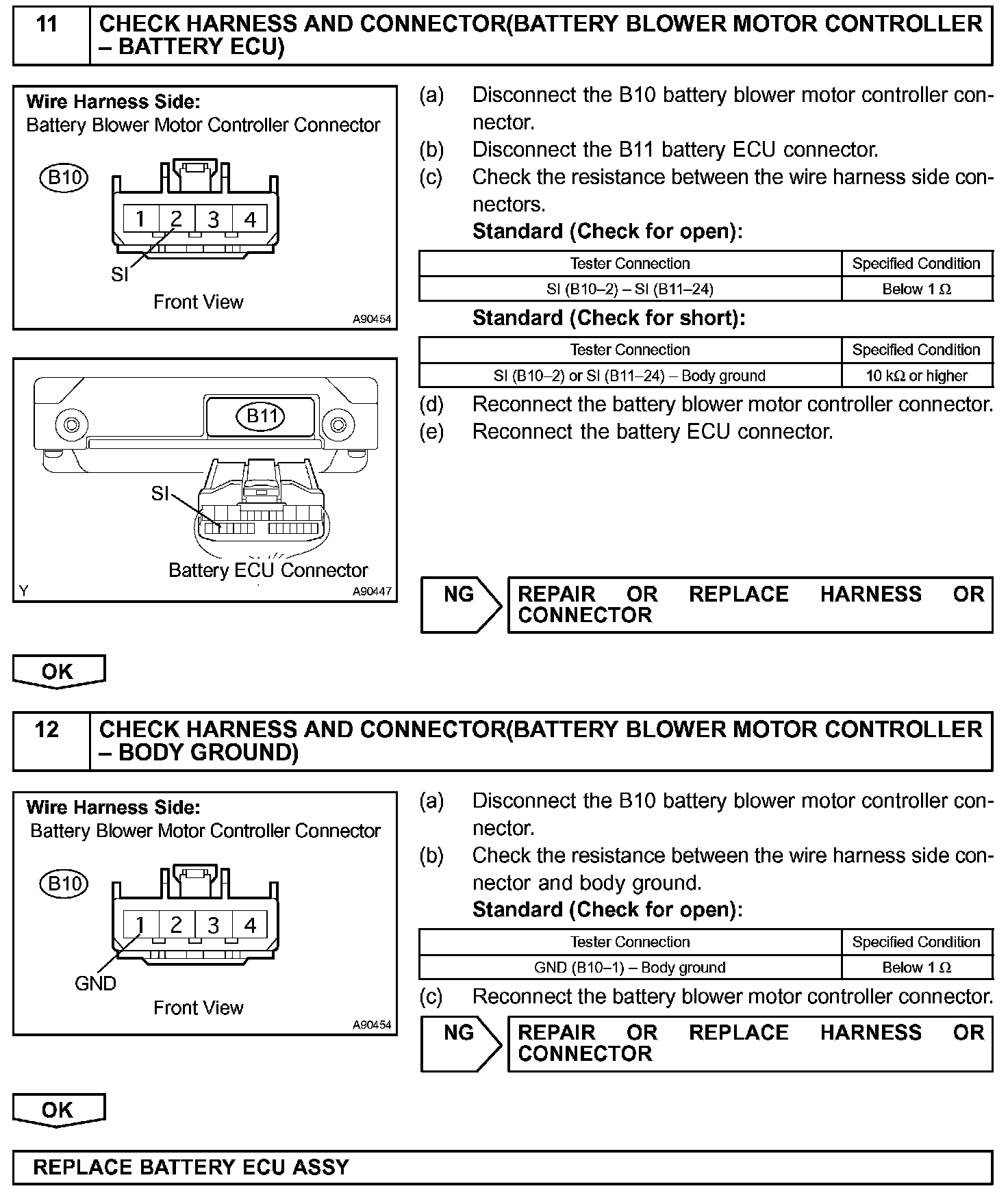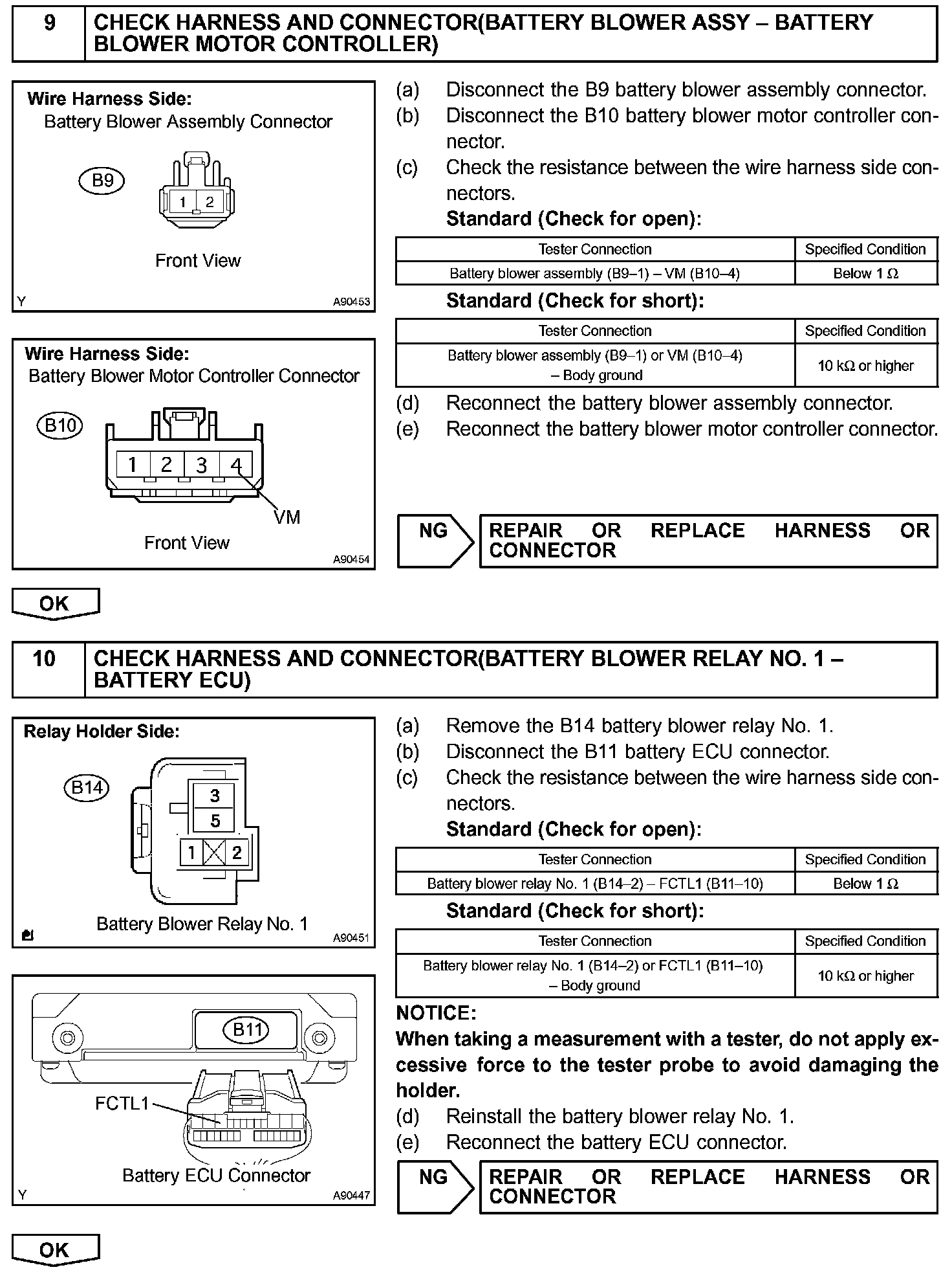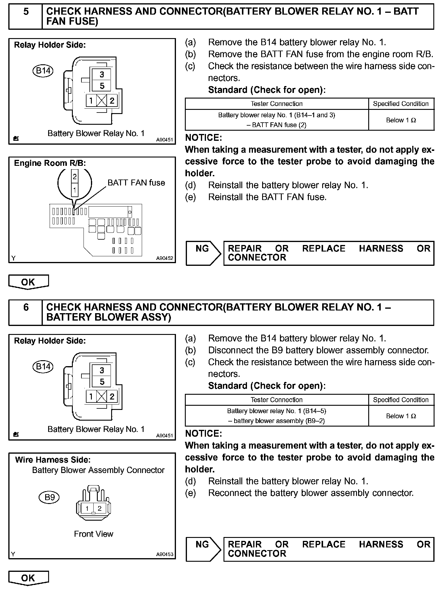 The current flows from the FCTL1 terminal of the battery ECU to the relay coil of the battery blower relay No. 1 and as the contact point of the relay closes, the power is supplied to the battery blower assembly. When a fan actuation signal is transmitted from the battery ECU, the blower motor controller adjusts voltage (VM) which is applied to the battery blower assembly in order to get the requested fan speed. The adjusted voltage is also transmitted to the VM terminal of the battery ECU in the form of a monitoring signal. The blower motor controller corrects the voltage at the blower motor by monitoring voltage at the +B terminal of the battery blower assembly.