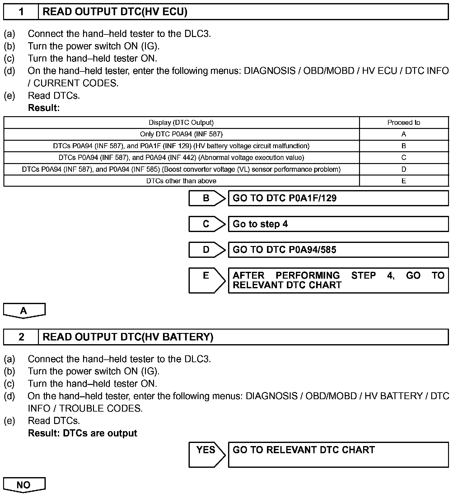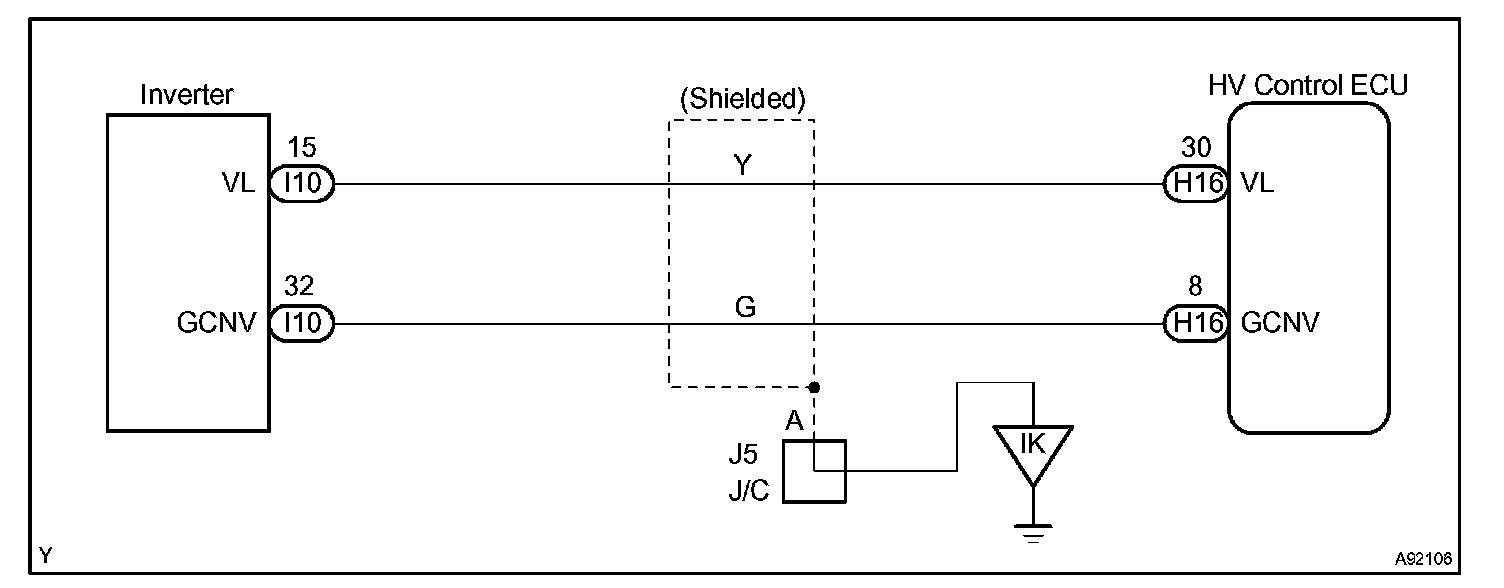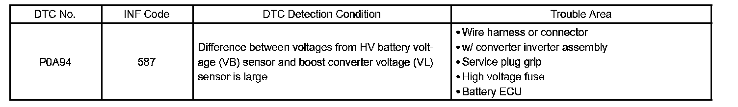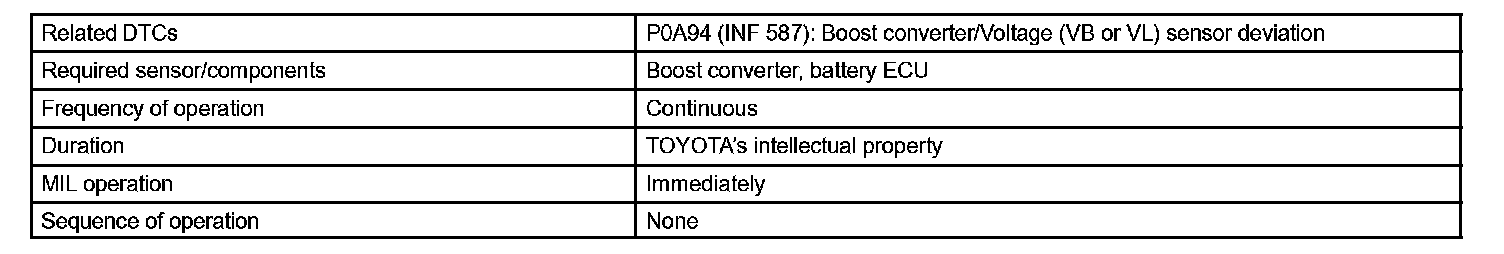The HV control ECU monitors signals of HV battery voltage (VB) and boost converter voltage (VL) sensors. When a large difference occurs between the voltages from the VB and VL sensors, the HV control ECU interprets this as a failure of either of the sensors. The HV control ECU then illuminates the MIL and sets a DTC.