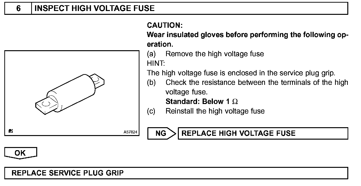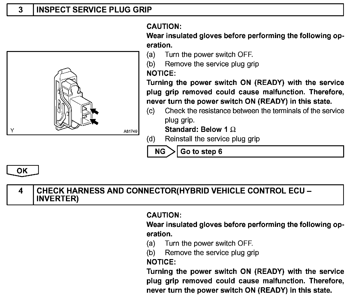 - Before inspecting the high-voltage system, take safety precautions to prevent electrical shocks, such as wearing insulated gloves and removing the service plug grip. After removing the service plug grip, put it in your pocket to prevent other technicians from reconnecting it while you are servicing the high-voltage system.