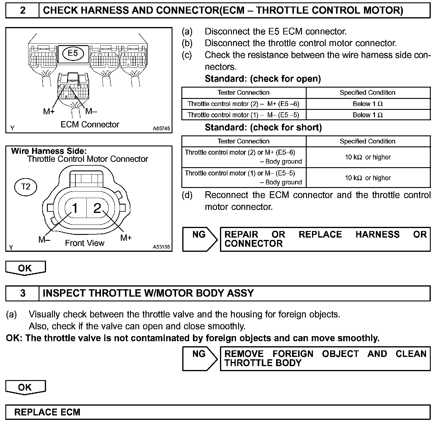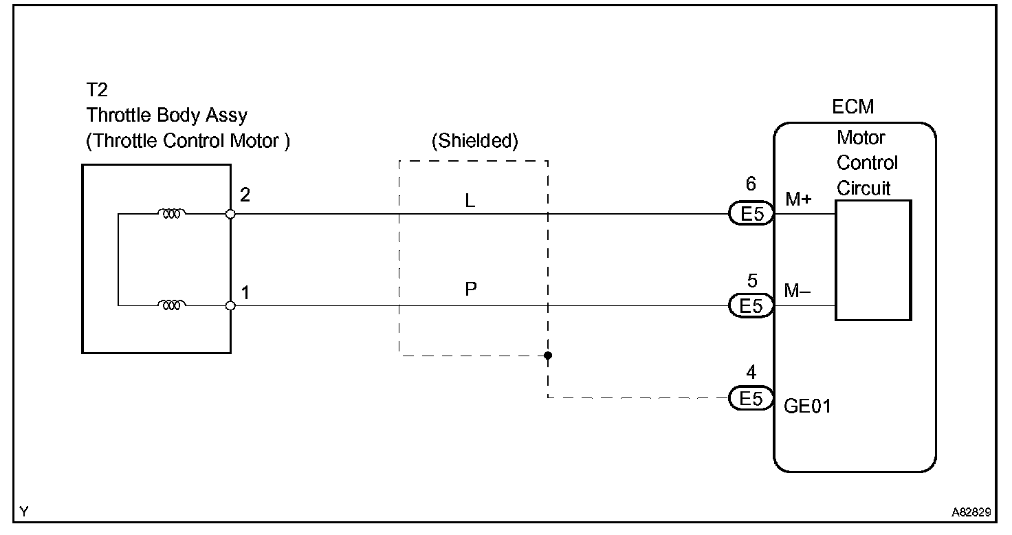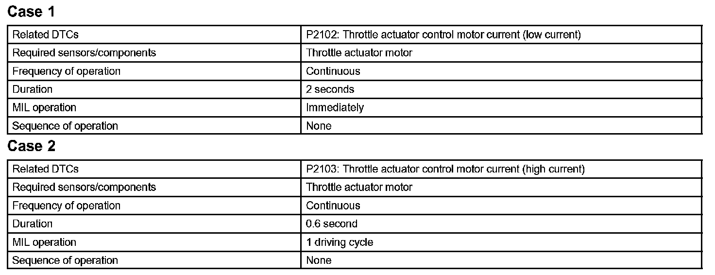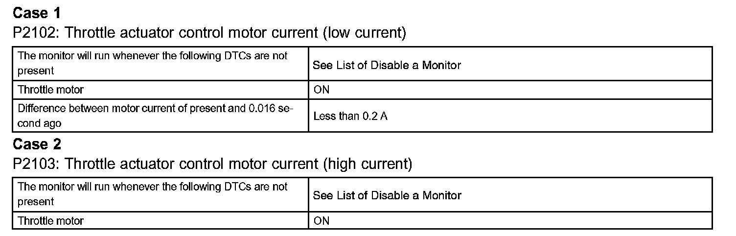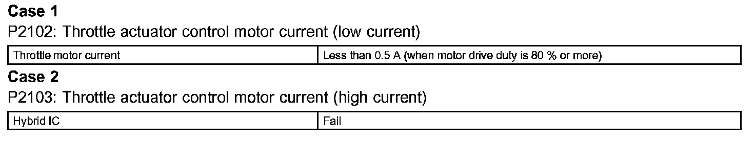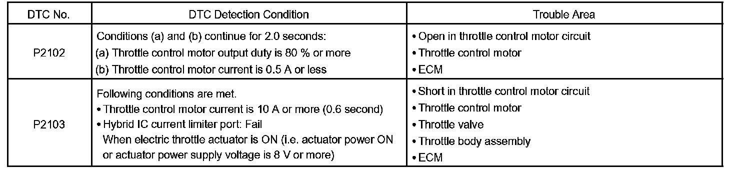 The ECM monitors the flow of electrical current through the electronic throttle motor, and detects malfunction or open circuits in the throttle motor based on the value of the electrical current. When the current deviates from the standard values, the ECM concludes that there is a fault in the throttle motor. Or, if the throttle valve is not functioning properly (for example, stuck ON), the ECM concludes that there is a fault in the throttle motor and turns on the MIL and a DTC is set.