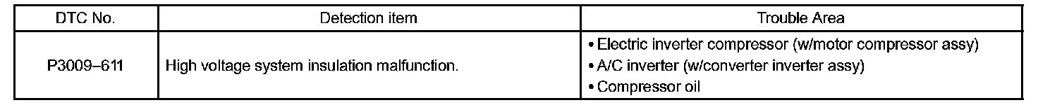 The DTC is output if there is insulation trouble with the high-voltage circuits in the air conditioning system. Insulation trouble with the electric inverter compressor or A/C inverter assembly may be the cause. Any oil other than ND-OIL 11 may have entered the refrigeration cycle.