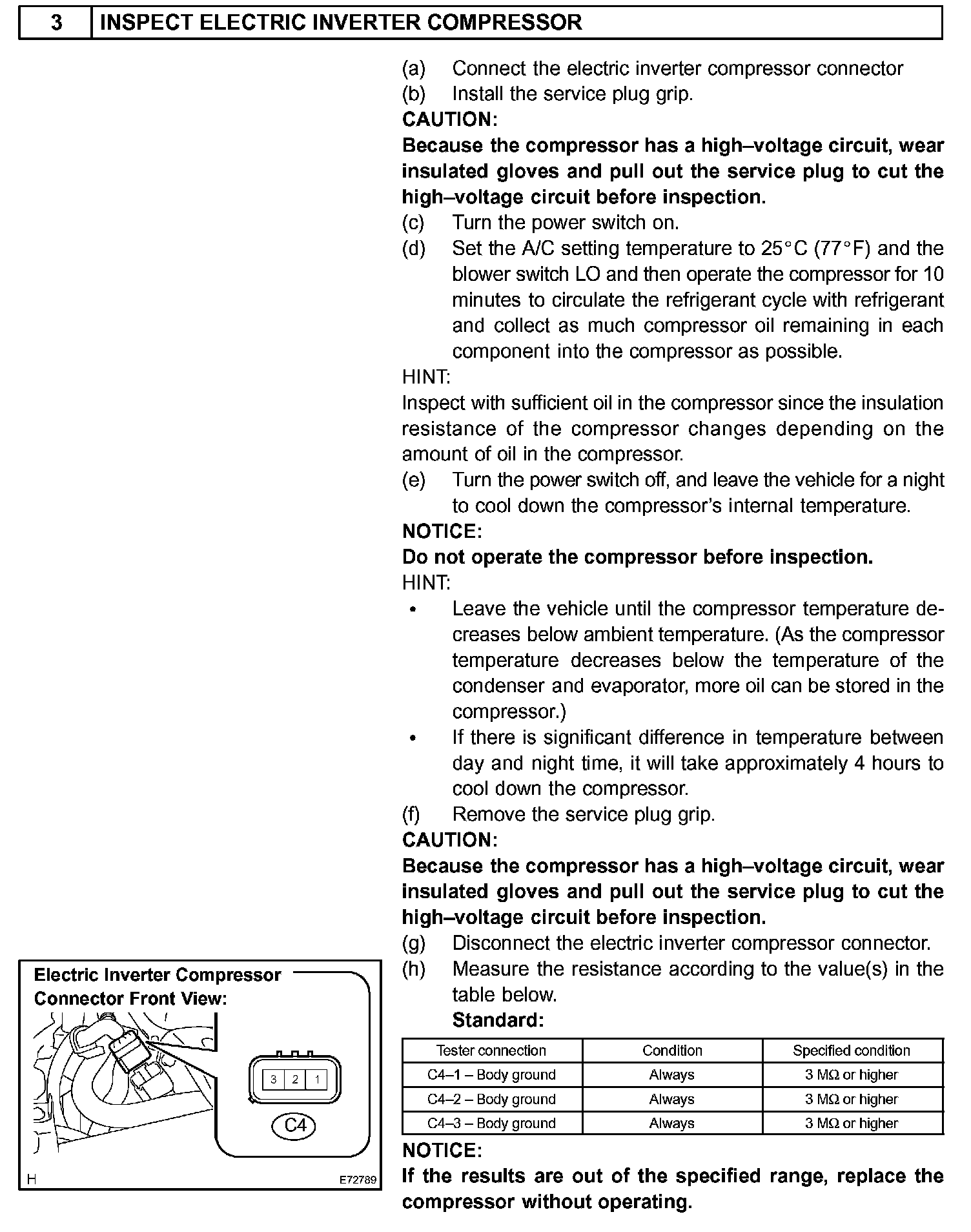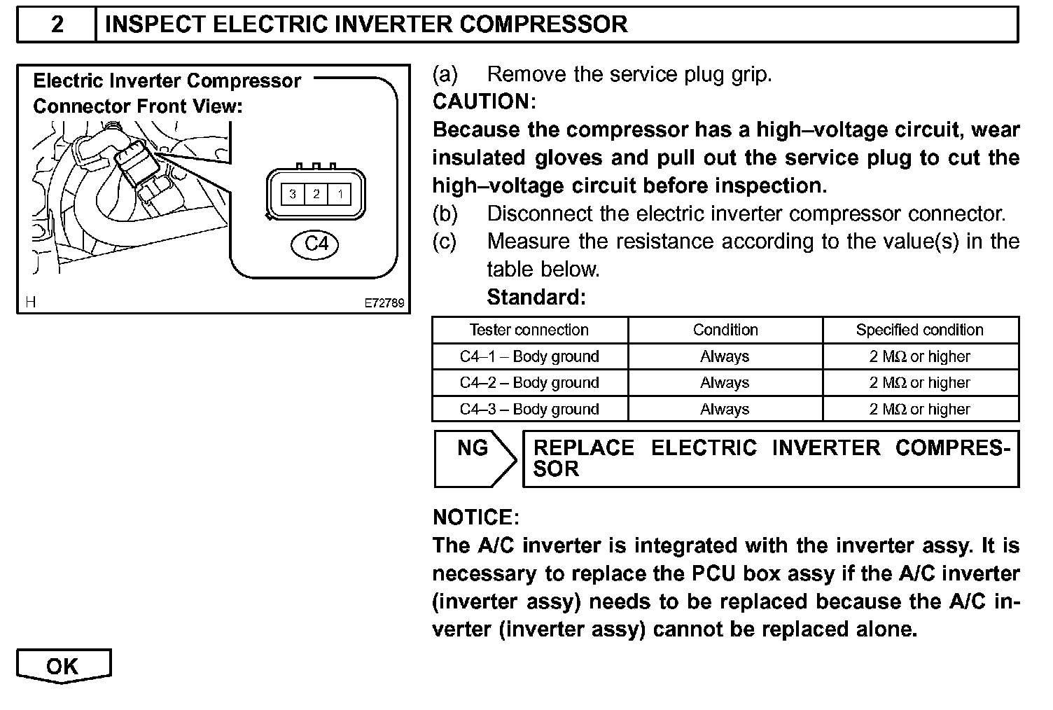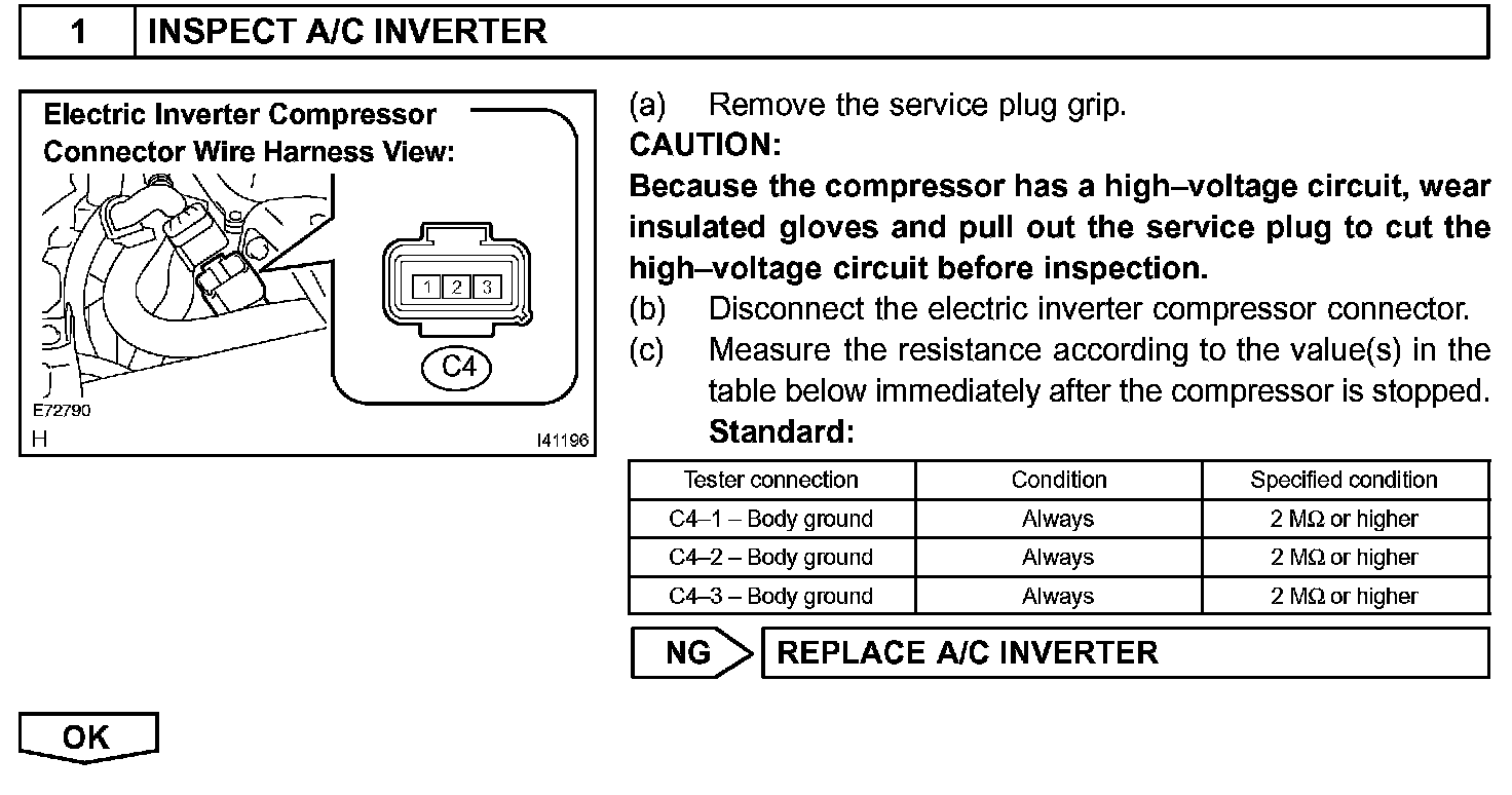 CAUTION: Wear insulated gloves and pull out the service plug grip before inspection as procedures may require disconnecting high-voltage connectors.