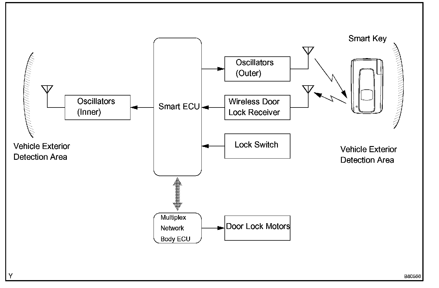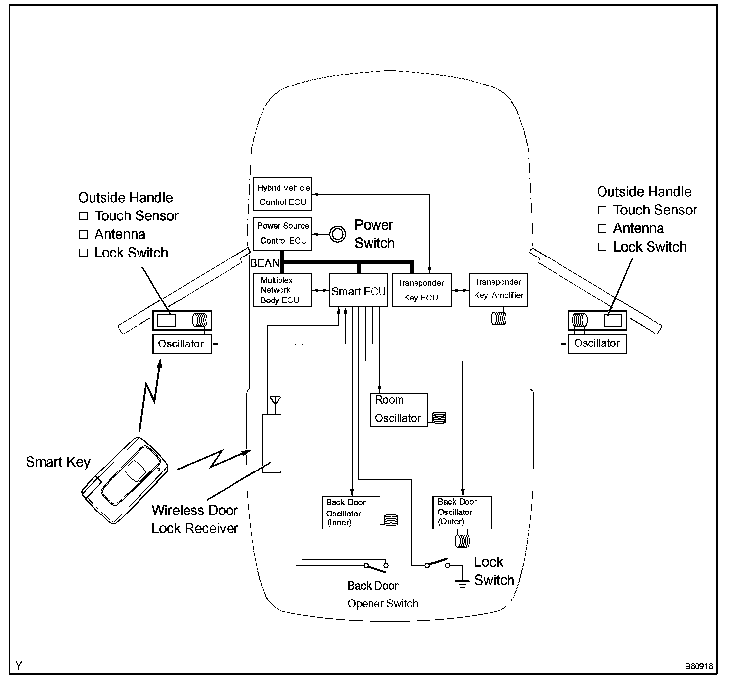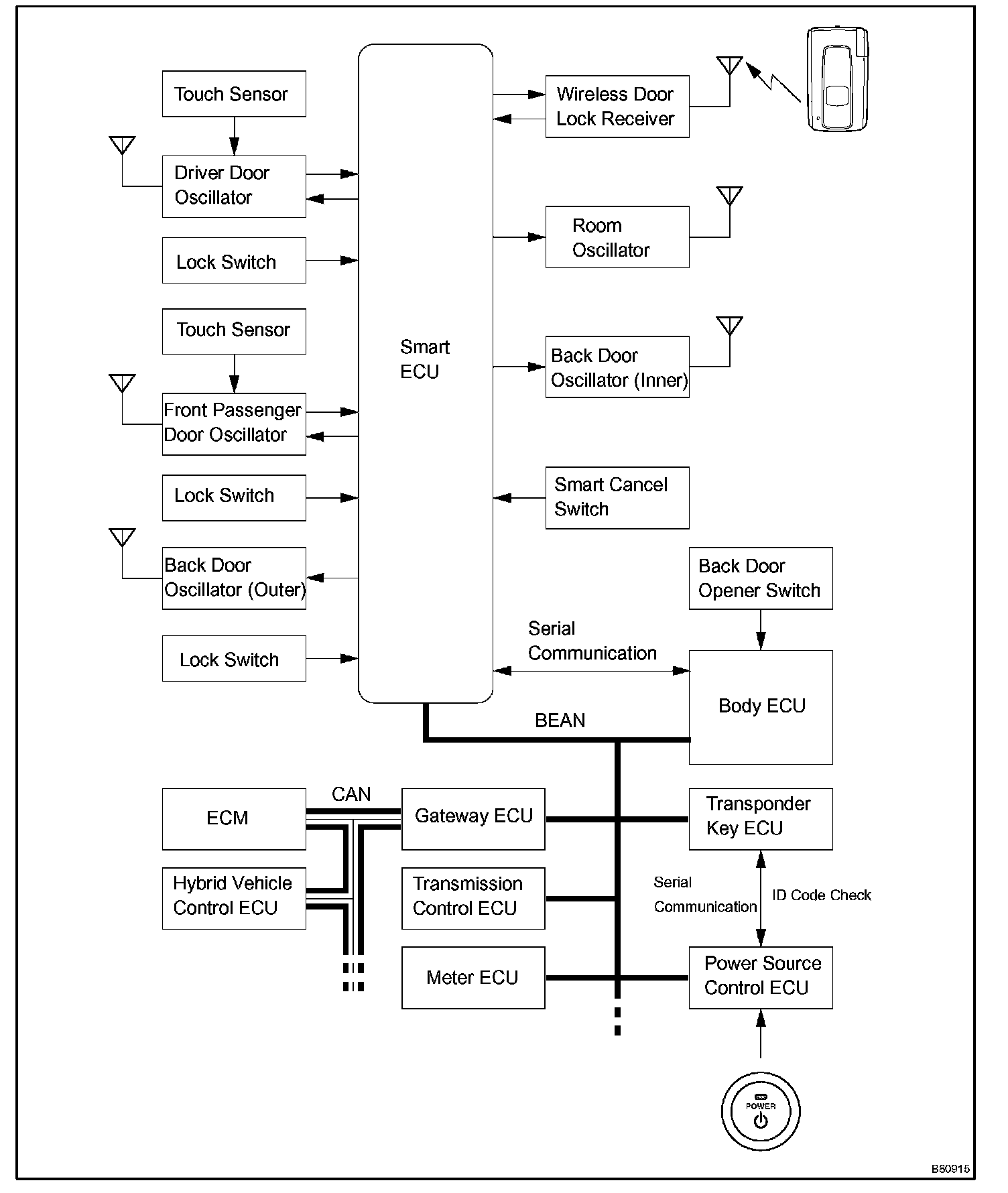 - This system consists of a smart key ECU, power source control ECU, transponder key ECU, body ECU, smart key, 5 oscillators, 5 antennas, 2 touch sensors, 3 lock switches, and a wireless door lock receiver. The smart ECU controls the system.